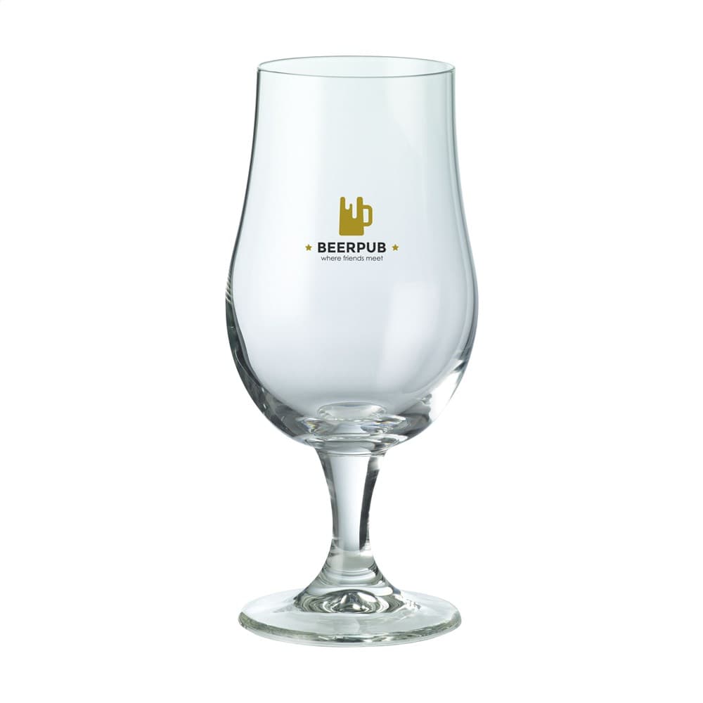 Wil je een bierglas bedrukken met een elegante uitstraling? Dit hoge bierglas op voet heeft een bolle kelk en een taps toelopende mondrand, en biedt met 370 ml inhoud de juiste vorm voor het serveren van speciaalbier.