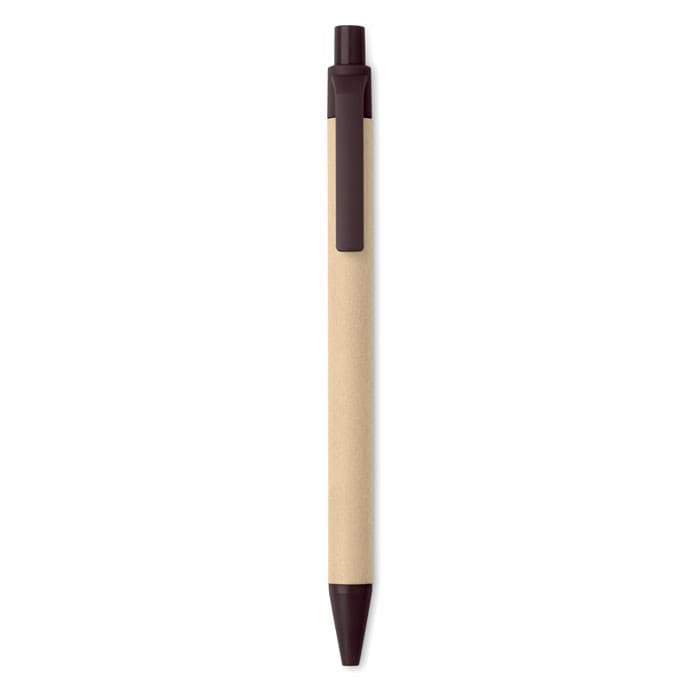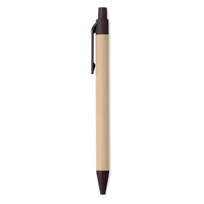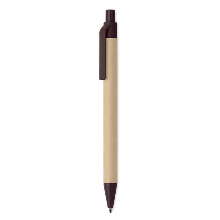 Balpen met papieren houder en drukmechanisme. De gekleurde delen zijn gemaakt van 40% koffieschillen/ 60% ABS. Blauwe inkt.