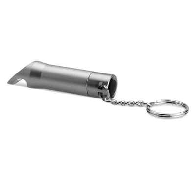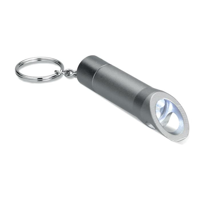 Metalen sleutelhanger met LED lampje en flessenopener. Inclusief 3x LR44 batterijen.