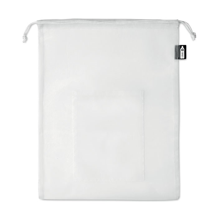 Voedseltas van RPET mesh met voorzakje en PP trekkoordsluiting.