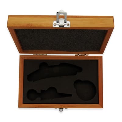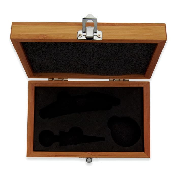 Wijnset in bamboe doosje met een kurkentrekker, wijnring en stop van roestvrijstaal en bamboe.