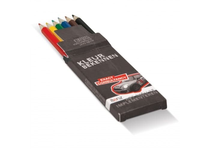 Zes kleine kleurpotloden in custom-made full-colour doosje. Ideaal voor kleurpotloden bedrukken.