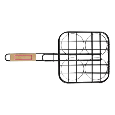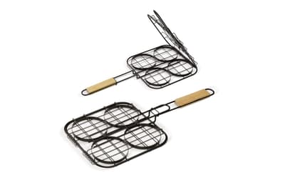 Hamburgergrill om vier hamburges in één keer te grillen. De hamburgers zijn in één handomdraai te draaien en je handen verbranden niet door het grote houten handvat.