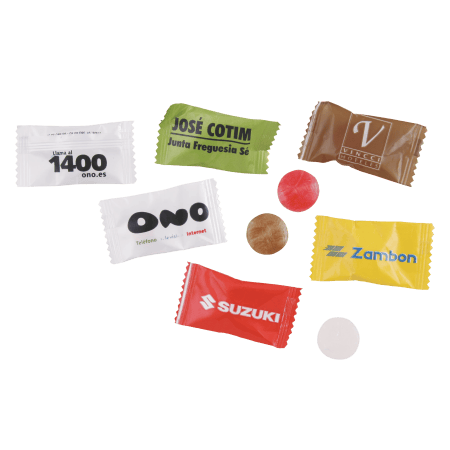 Flowpack 55 x 30 mm. met 1 zuurtje. Zuurtje in diverse smaken en kleuren te verkrijgen. Verpakking in transparant of standaard wit.