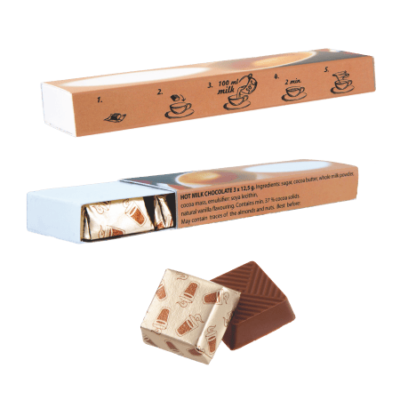 Hot chocolate 3 stuks in bedrukt doosje. Door het toevoegen van warme melk krijg je een heerlijke warme chocolademelk