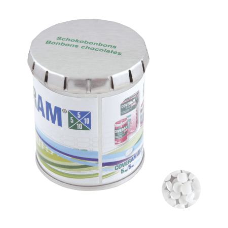 Hoog click clack blik Ø 53 mm x 60 mm met ca. 80 gr. mintjes, ook te vullen met diverse vullingen: mintjes, extra sterke `triangle` mintjes, chococarletties, jelly beans of vruchten hartjes.