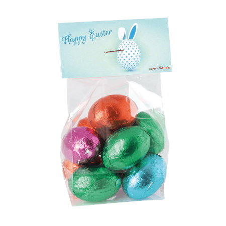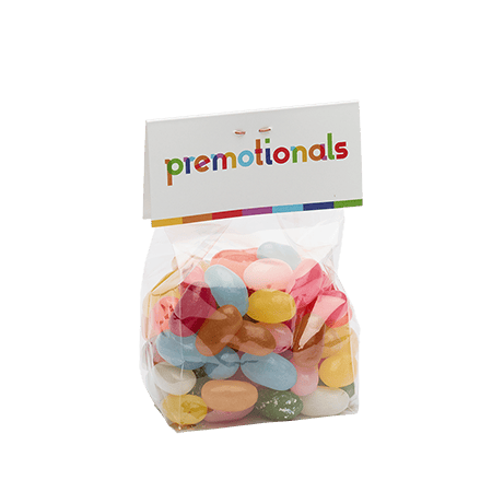 PP Blokbodemzakje 60/22x20x200 mm gevuld met ca. 100 gr. snoep categorie Speciaal, met tot in full colour bedrukt kopkaartje