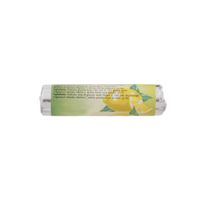 Promotie rol Ø 12x50 mm met fruit dextrose assorti, 9 tabletten, bedrukking mogelijk t/m 4 kleuren