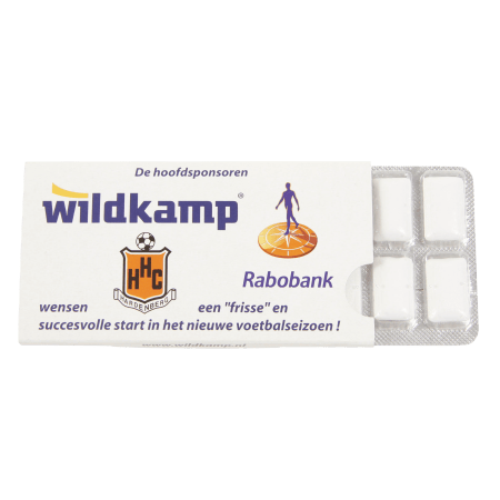 Kauwgom Xylitol in blister 12 stuks, 105x55x8 mm, in een bedrukte kartonnen huls tot full colour