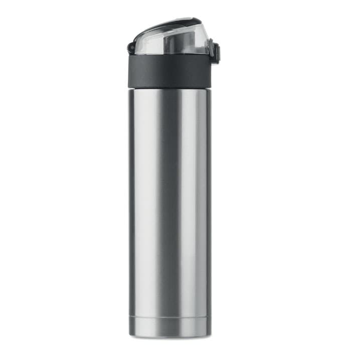 Dubbelwandige drinkfles van roestvrijstaal met deksel met veiligheidsslot. Makkelijk mee te nemen door de opvouwbare grip aan de bovenkant. 400 ml. Lekvrij. Lekvrij.