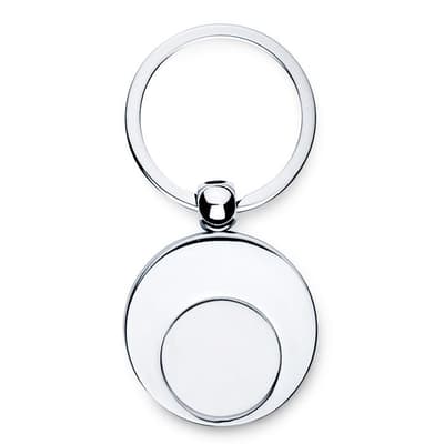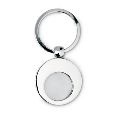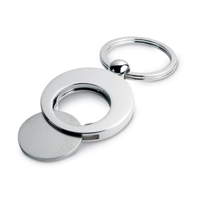 Ronde metalen sleutelhanger met binnenin een winkelwagenmuntje. Ideaal voor de supermarkt.