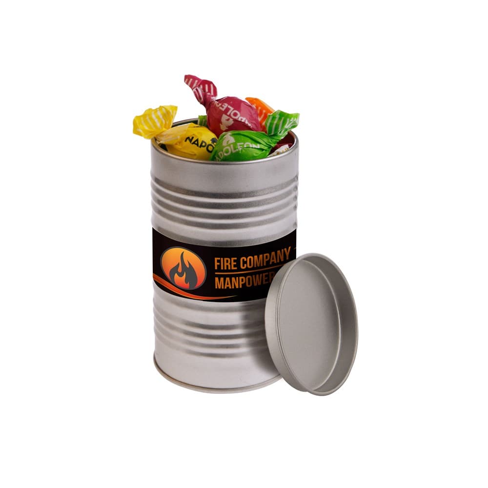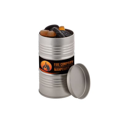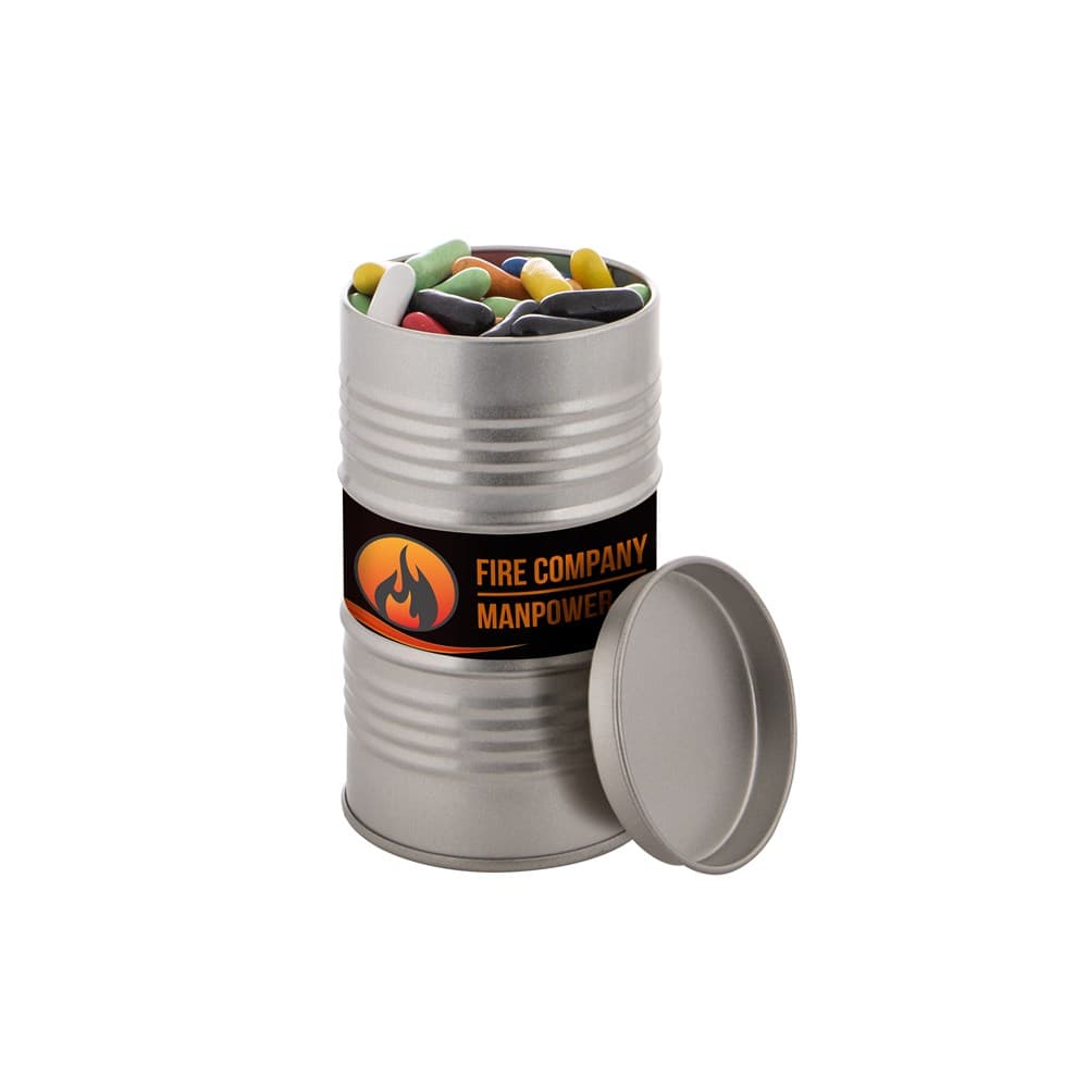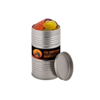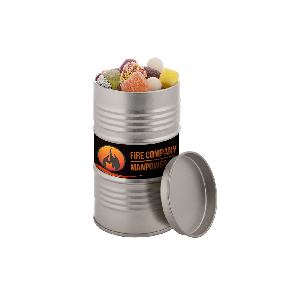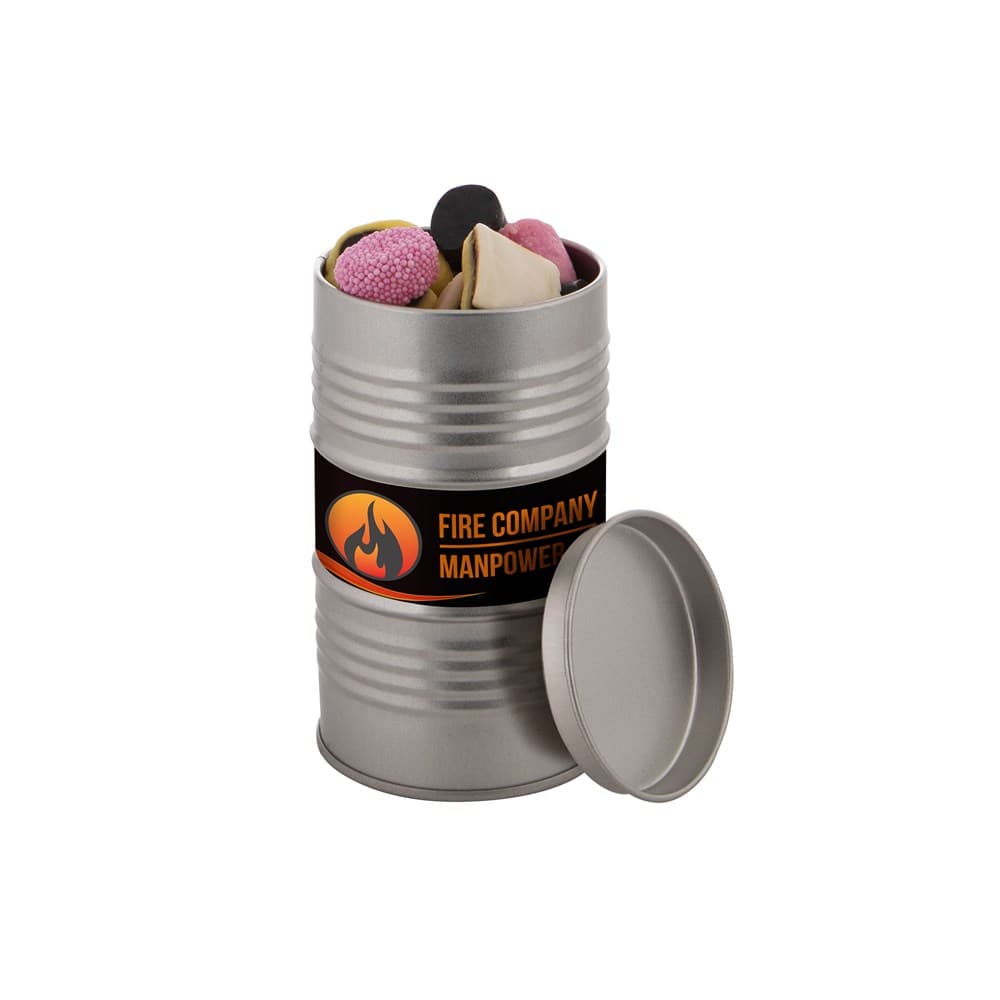 Olievat blik voorzien van een full colour sticker en gevuld met dropstaafjes