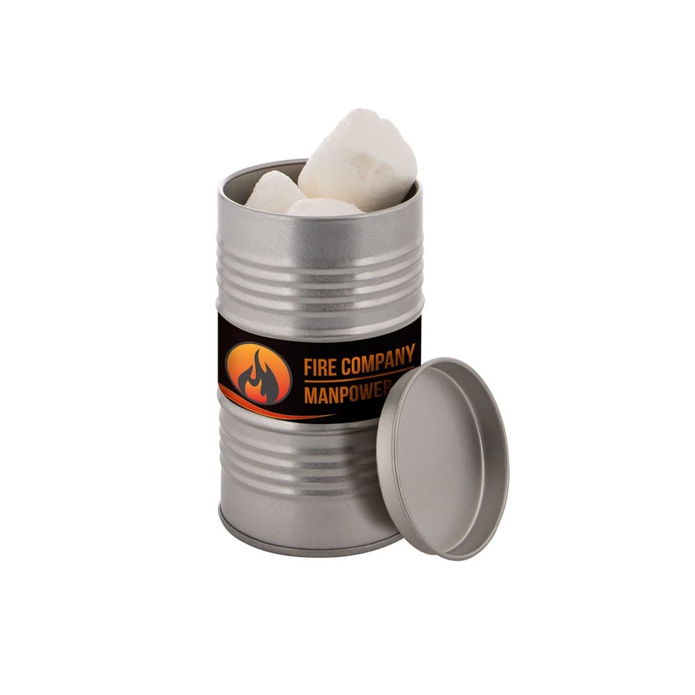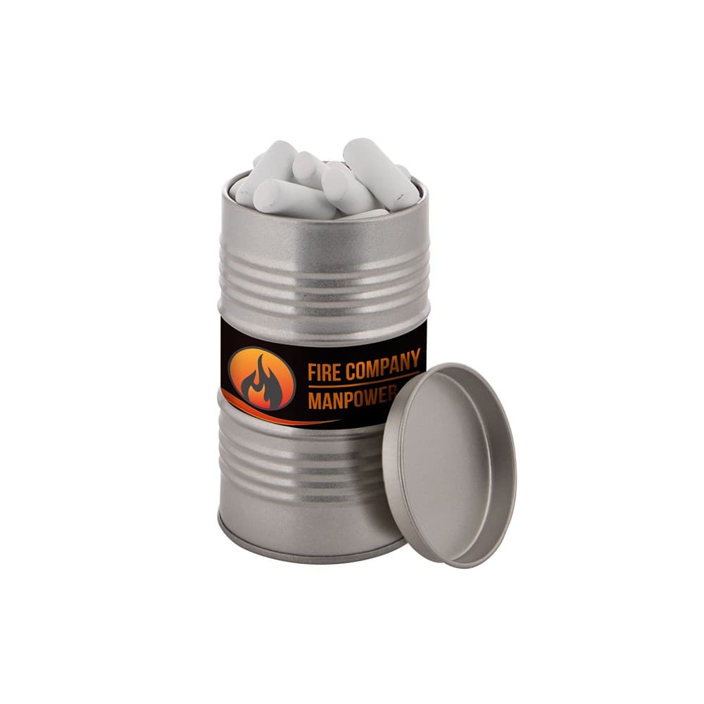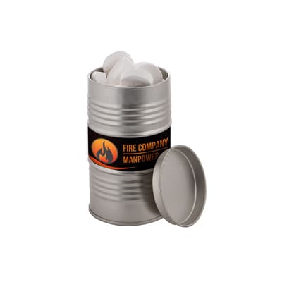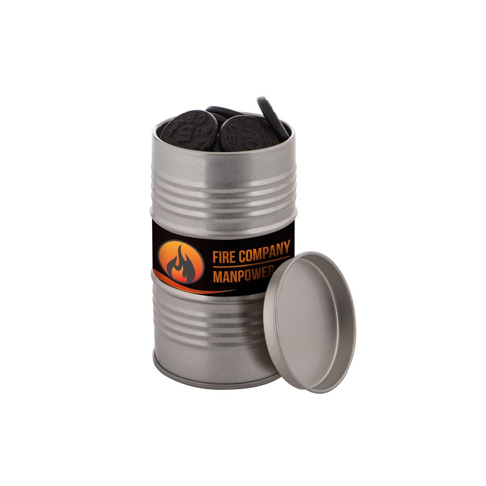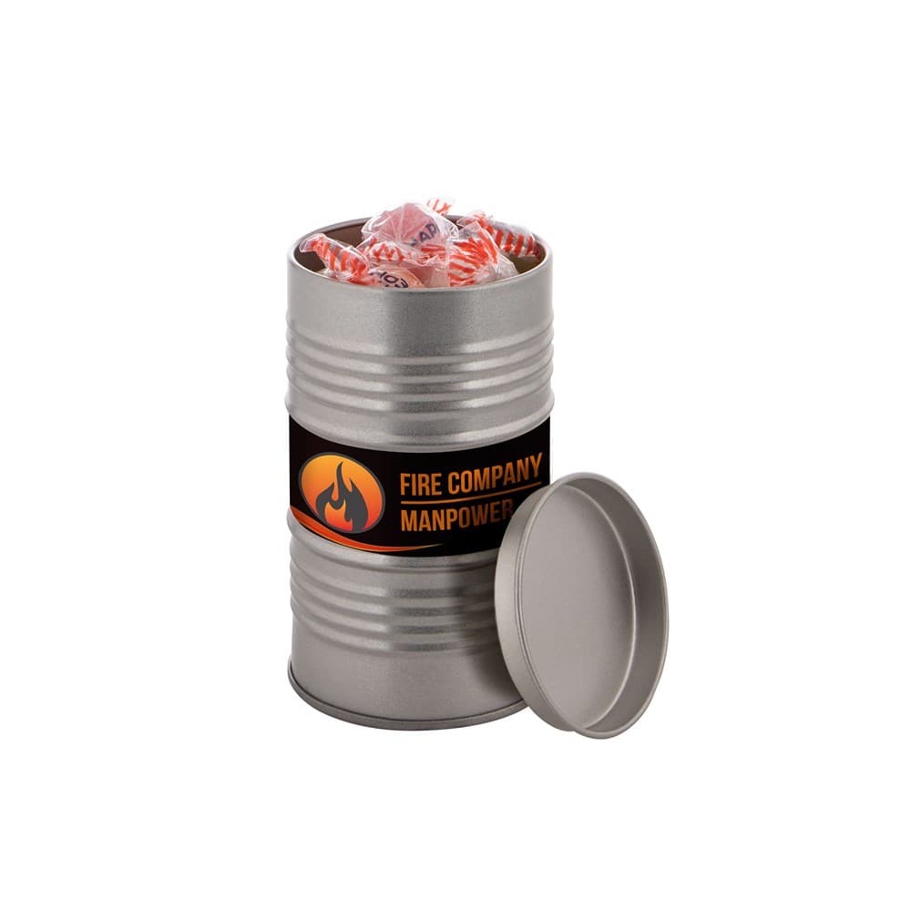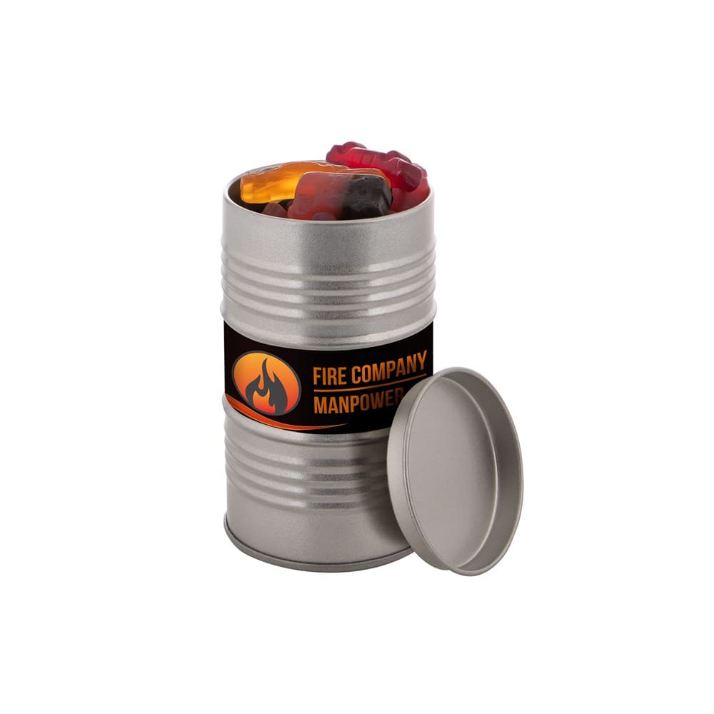 Olievat blik voorzien van een full colour sticker en gevuld met dropstaafjes