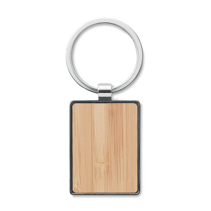 Rechthoekige sleutelhanger van zink alloy met bamboe front. Bamboe is een natuurlijk materiaal waardoor kleur per item kan verschillen.