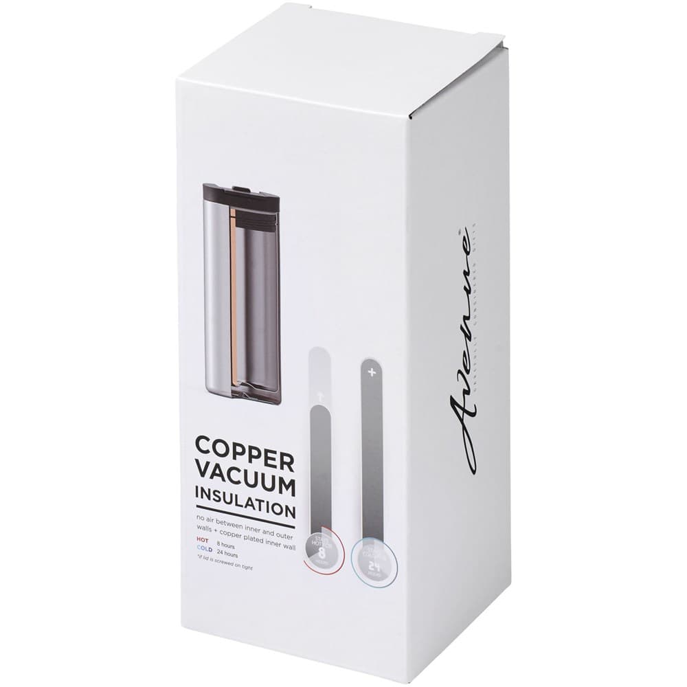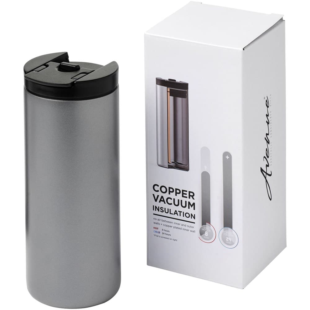 Een compacte en duurzame beker die ideaal is voor werk of reizen. De beker heeft een dubbelwandige vacuümconstructie met koper isolatie, waardoor dranken 8 uur warm en 24 uur koud blijven. Het deksel kan worden afgesloten. De constructie voorkomt daarnaast condensatie aan de buitenkant van de beker. Volumecapaciteit is 360 ml. Gepresenteerd in een Avenue geschenkverpakking.