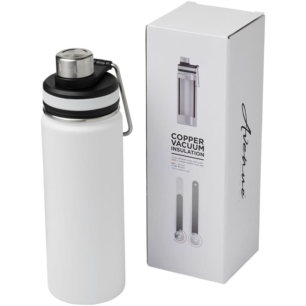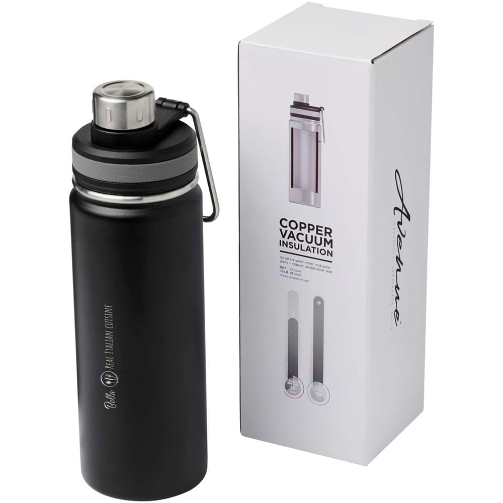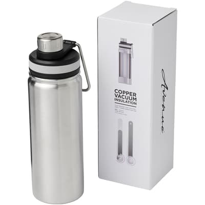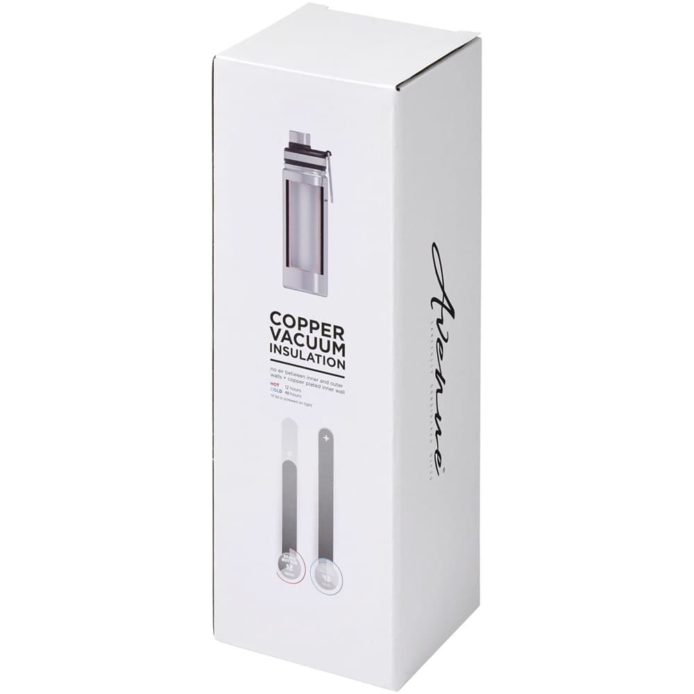 Dubbelwandige roestvrijstalen vacuümconstructie met koper isolatie, waarmee drankjes minstens 12 uur warm of 48 uur koud blijven. De constructie voorkomt ook condensatie aan de buitenkant van de fles. Voorzien van een schroefdop en roestvrijstalen deksel met een handig handvat voor draagcomfort. Eenvoudig te reinigen en vullen door de dubbele opening. Volumecapaciteit is 590 ml. Gepresenteerd in een Avenue geschenkverpakking.