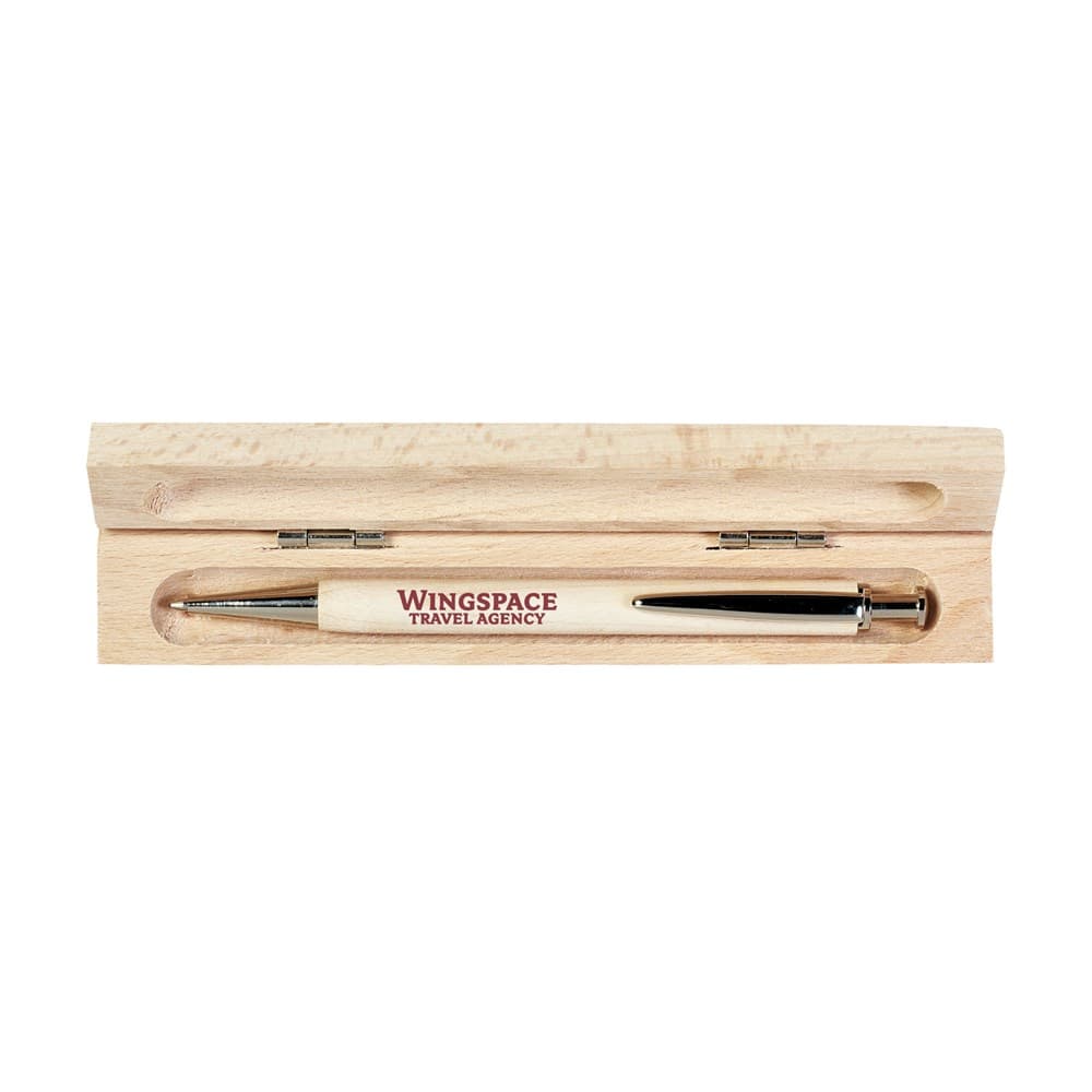 WoW! Blauwschrijvende balpen van massief beukenhout met verchroomde clip, drukknop, puntstuk. In beukenhouten cassette.