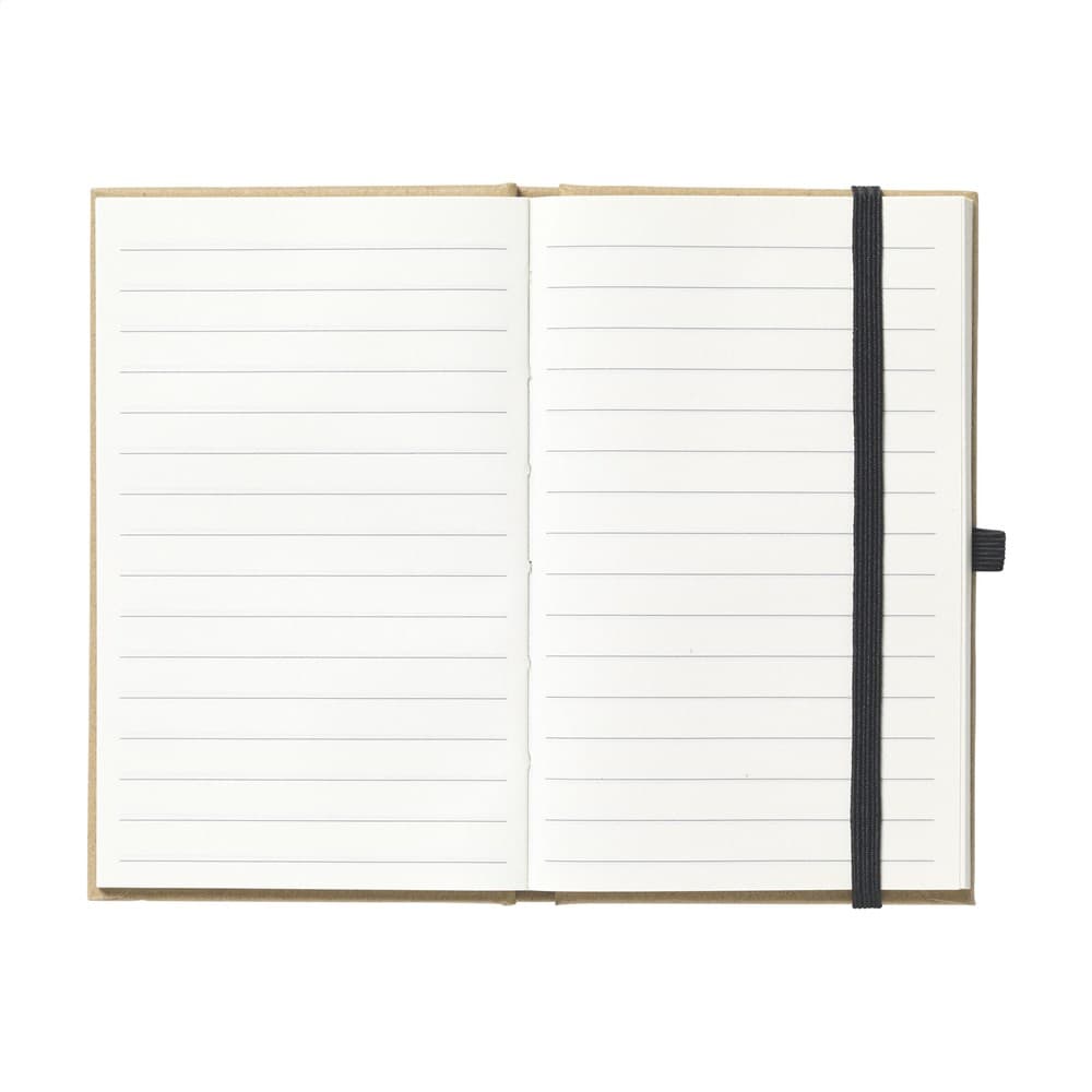 Milieuvriendelijk, A6 formaat notitieboekje van gerecycled materiaal. Met ca. 80 vel/160 pagina's crèmekleurig, gelinieerd FSC®MIX-gecertificeerd papier (70 g/m²), handige penlus en elastische sluiting.