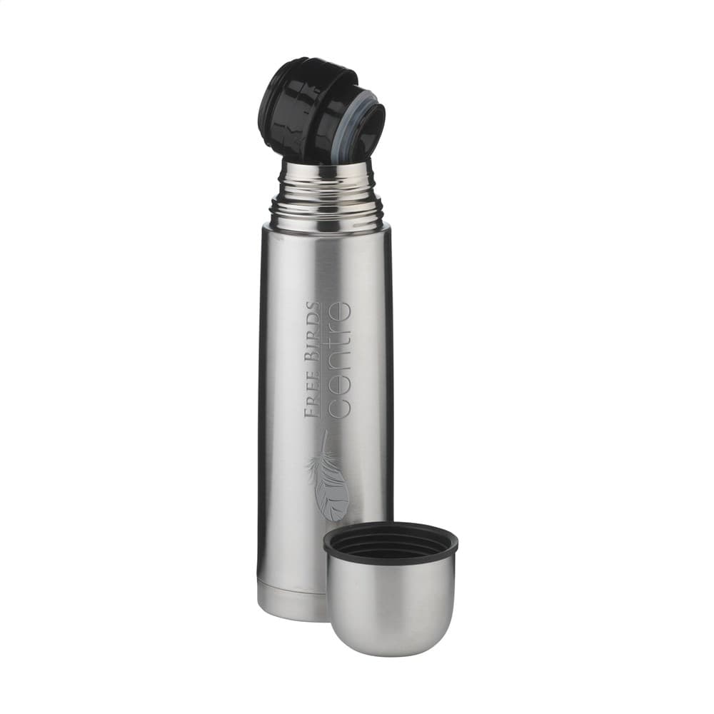Dubbelwandige, vacuüm geïsoleerde, RVS thermosfles. Onbreekbaar en ijzersterk. De vacuümruimte tussen de wanden isoleert de inhoud en houdt dranken lange tijd warm of koud. Met schroefdop/drinkbeker en handig schenksysteem met druksluiting. Lekvrij. Inhoud 500 ml. Per stuk in doosje.