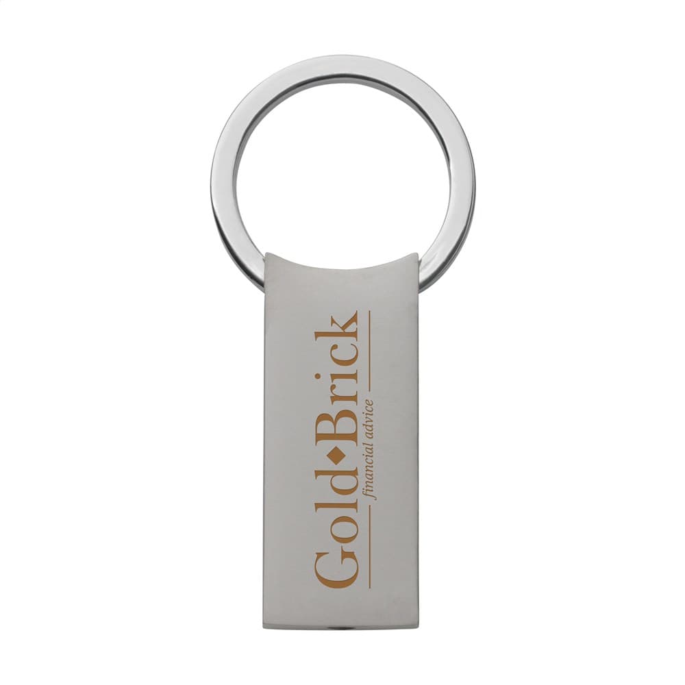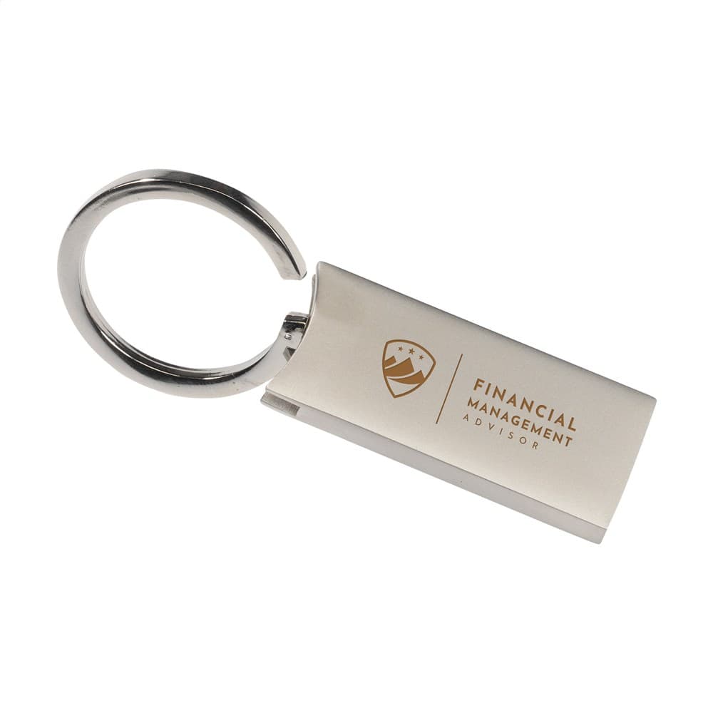 Matmetalen sleutelhanger met stevige zekerheidsring en kliksysteem. Per stuk in kraft envelop.