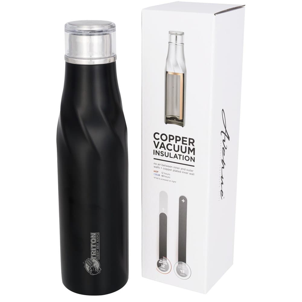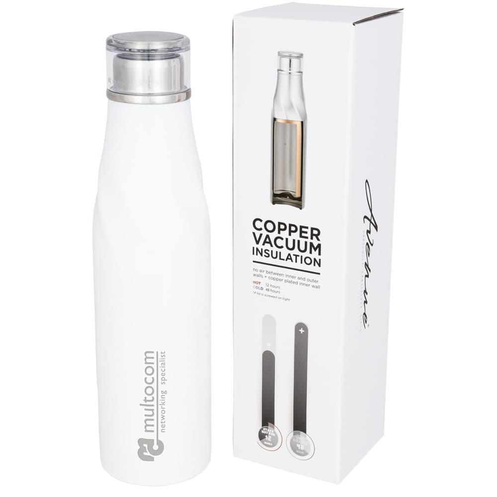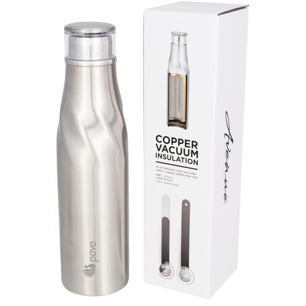 Ontwerp met zelfsluitende dop voor gemakkelijk openen en een comfortabelere drinkervaring. Brede opening voor comfortabel vullen en schenken. Duurzaam, dubbelwandig roestvrijstalen vacuümconstructie met koperisolatie, waarmee uw drankje warm blijft gedurende 12 uur en koud gedurende 48 uur met de zelfsluitende en morsbestendige dop. Capaciteit is 650 ml. Gepresenteerd in een Avenue geschenkverpakking, ideaal voor thermoflessen bedrukken!
