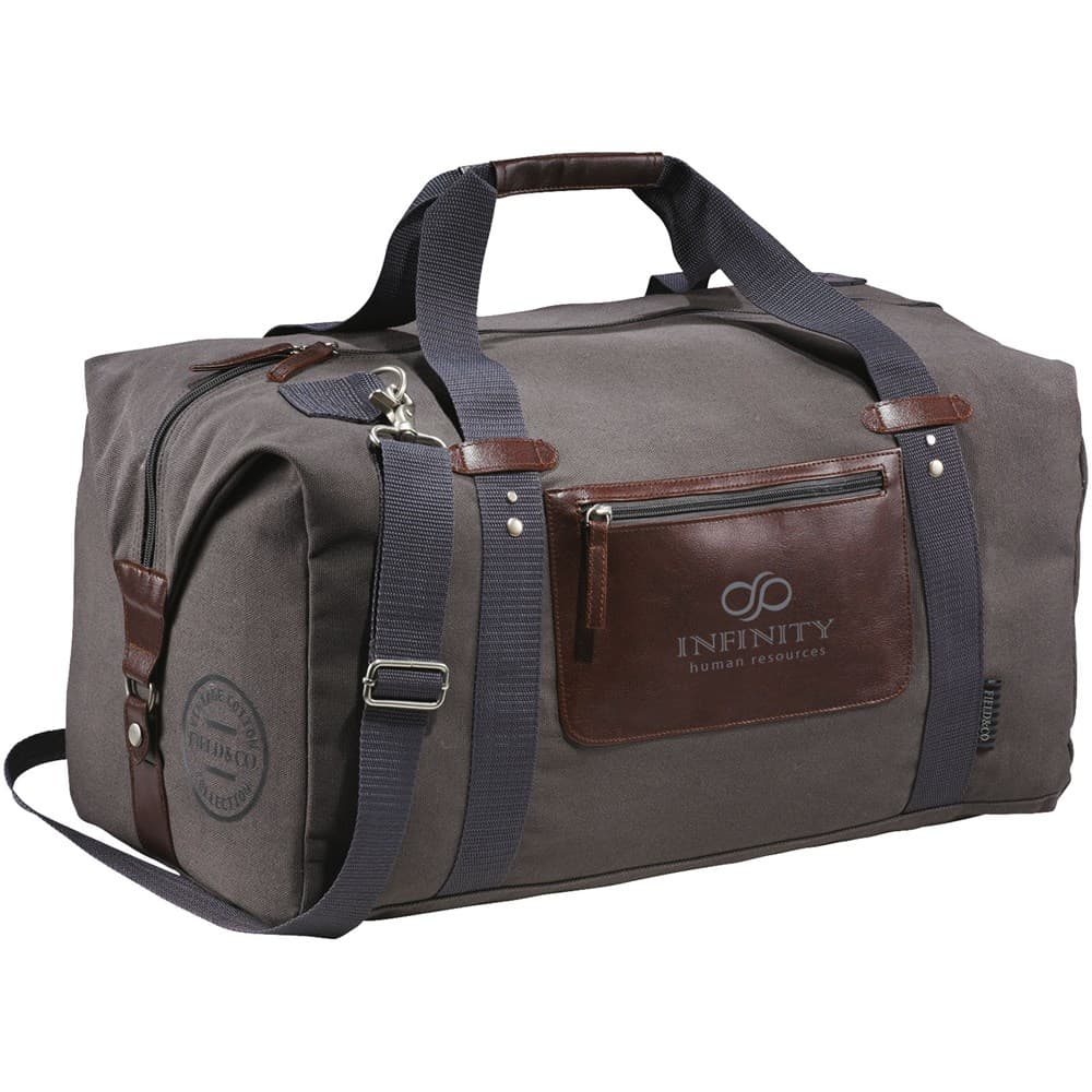 Duffeltas met exclusief design, gemaakt van katoen, met een groot hoofdvak en unieke Field & Co.™ details. Vinyl accenten, voorvak met rits en duurzame handgrepen. Zijden kunnen naar beneden worden gedaan en vastgezet wanneer u niet veel draagt, of u kunt de zijkanten losmaken wanneer de tas volledig is gevuld. Geschikt voor bevestiging aan trolleykoffer.