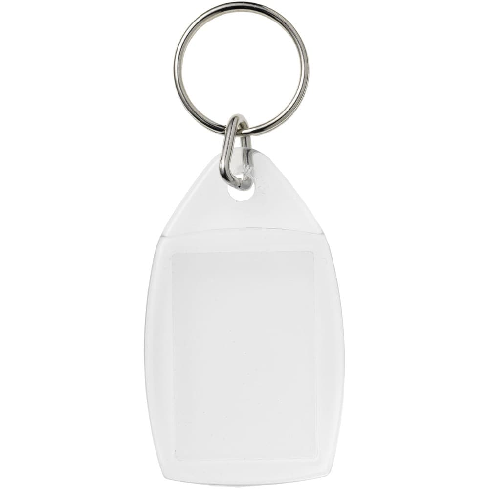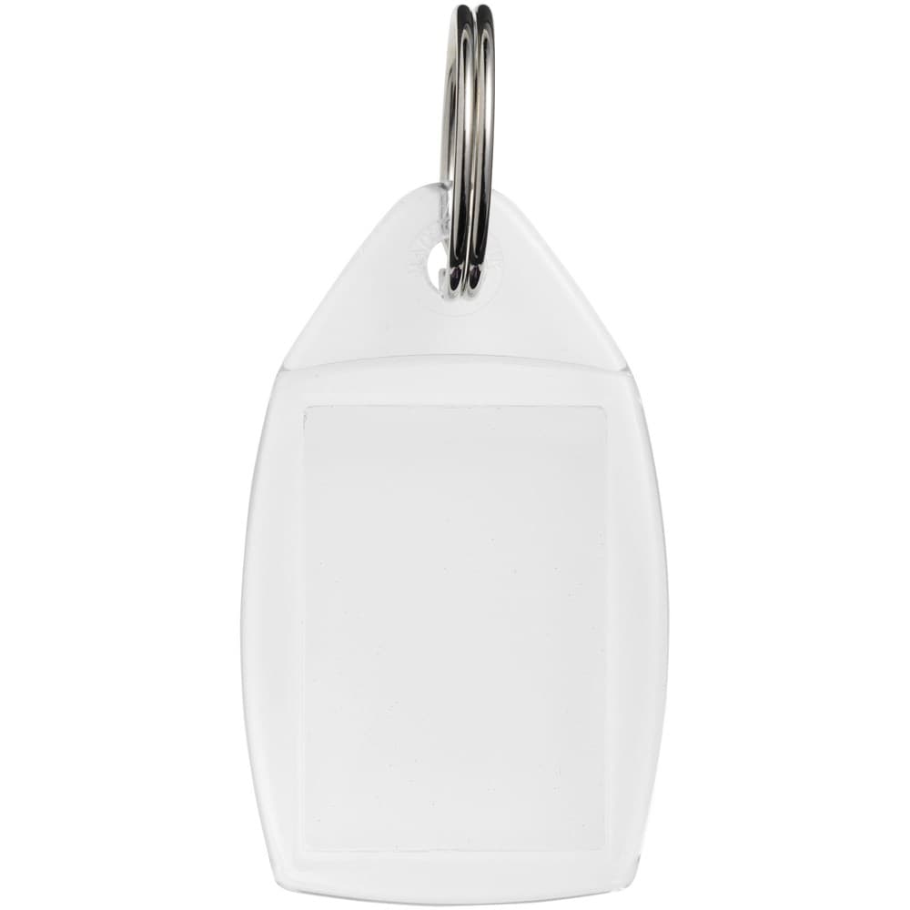 Doorzichtige P5 sleutelhanger met metalen sleutelring. Afmetingen van het te bedrukken inzetstuk: 3,5 cm x 2,4 cm.