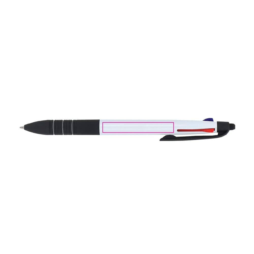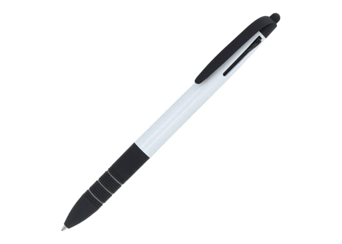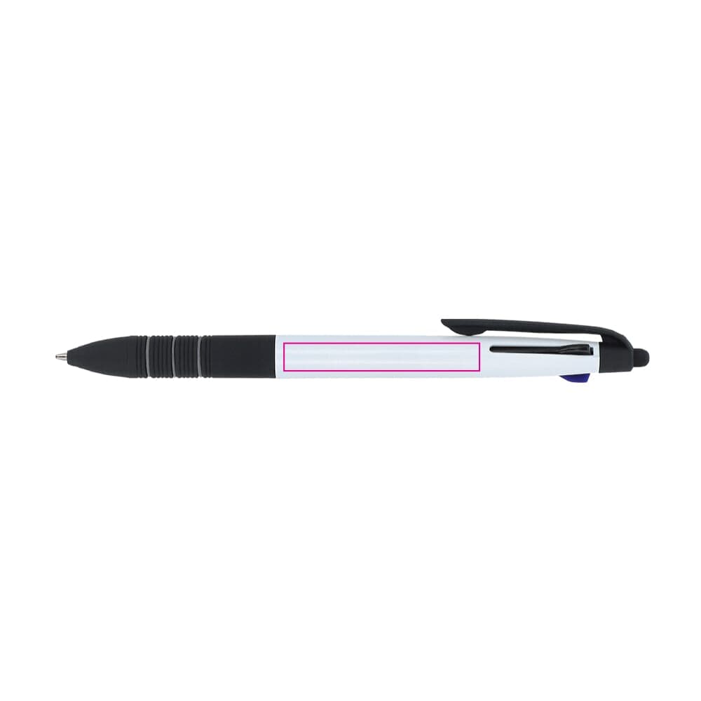 Driekleurige balpen met stylus en ergonomische grip. De schrijfkleuren zijn zwart, blauw en rood.