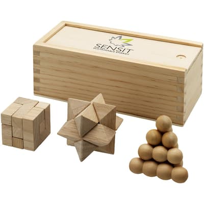 3 in 1 puzzel in een houten geschenkverpakking. Decoratie niet beschikbaar op de puzzel.