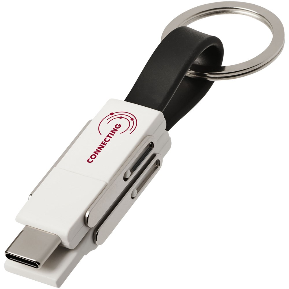 Eén 4-in-1 kabel die alle oplaadbehoeften in één pakket bevat. Het bevat een USB type-A, type-C en een 2-in-1 uiteinde dat compatibel is met zowel iOS- als Android-apparaten. Het kan worden gebruikt voor opladen en gegevensuitwisseling. Wordt geleverd met een sleutelhanger en heeft magneten om gemakkelijk te kunnen dragen.