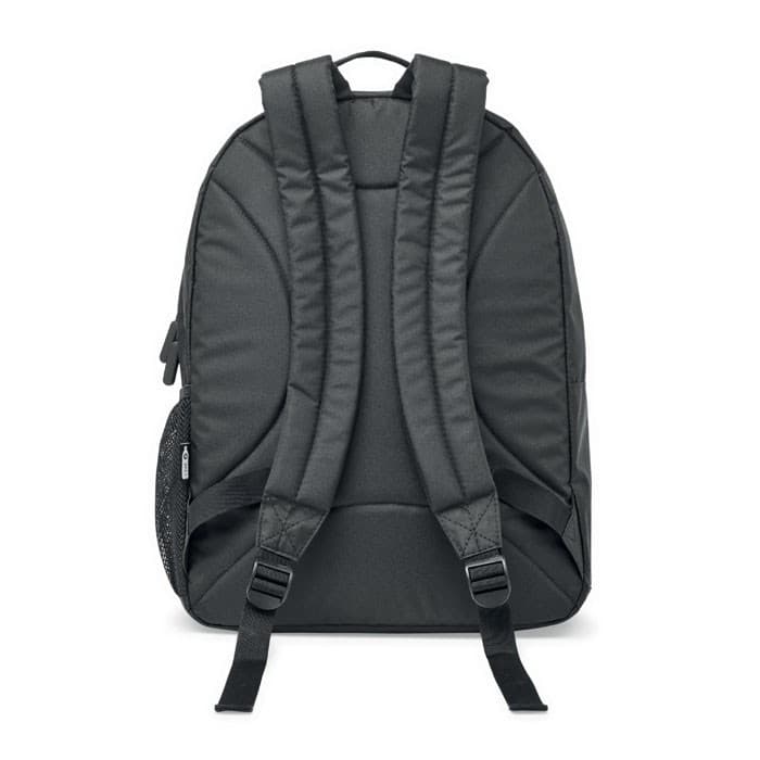 15 inch laptop rugzak van 300D RPET polyester. Met 2 grote vakken met rits, dubbele voorvakken met rits en zijvak van gaas. Gewatteerde rug- en schouderbanden.