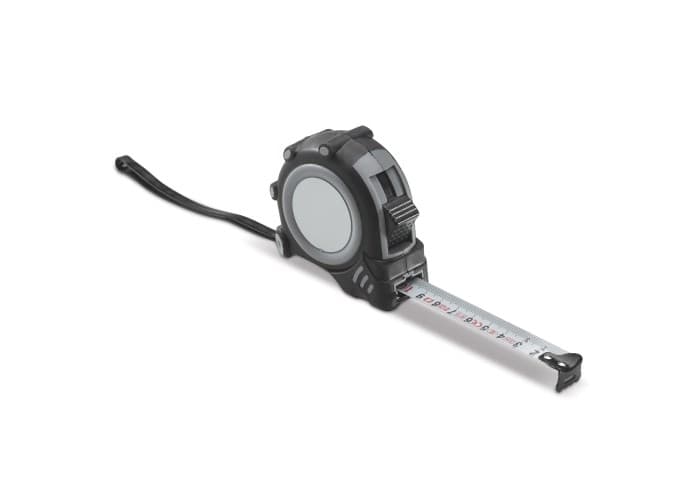 Rolmaat fix met een meetbereik van vijf meter en een wit meetlint. Eenvoudig mee te nemen dankzij de broekklem en is nauwkeurig door de haak aan het begin van het meetlint.