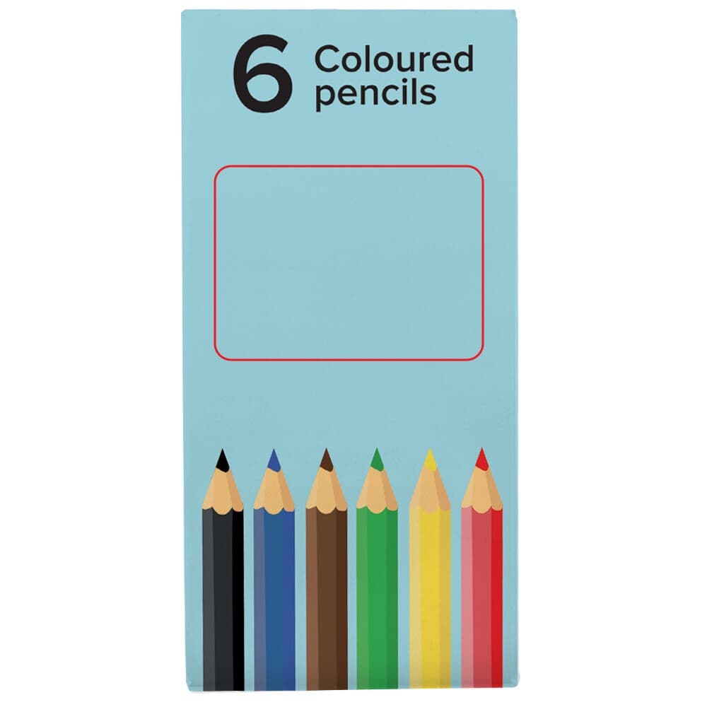 Zes kleine kleurpotloden in kartonnen doosje. Vanaf 250 stuks custom-made doosje mogelijk.