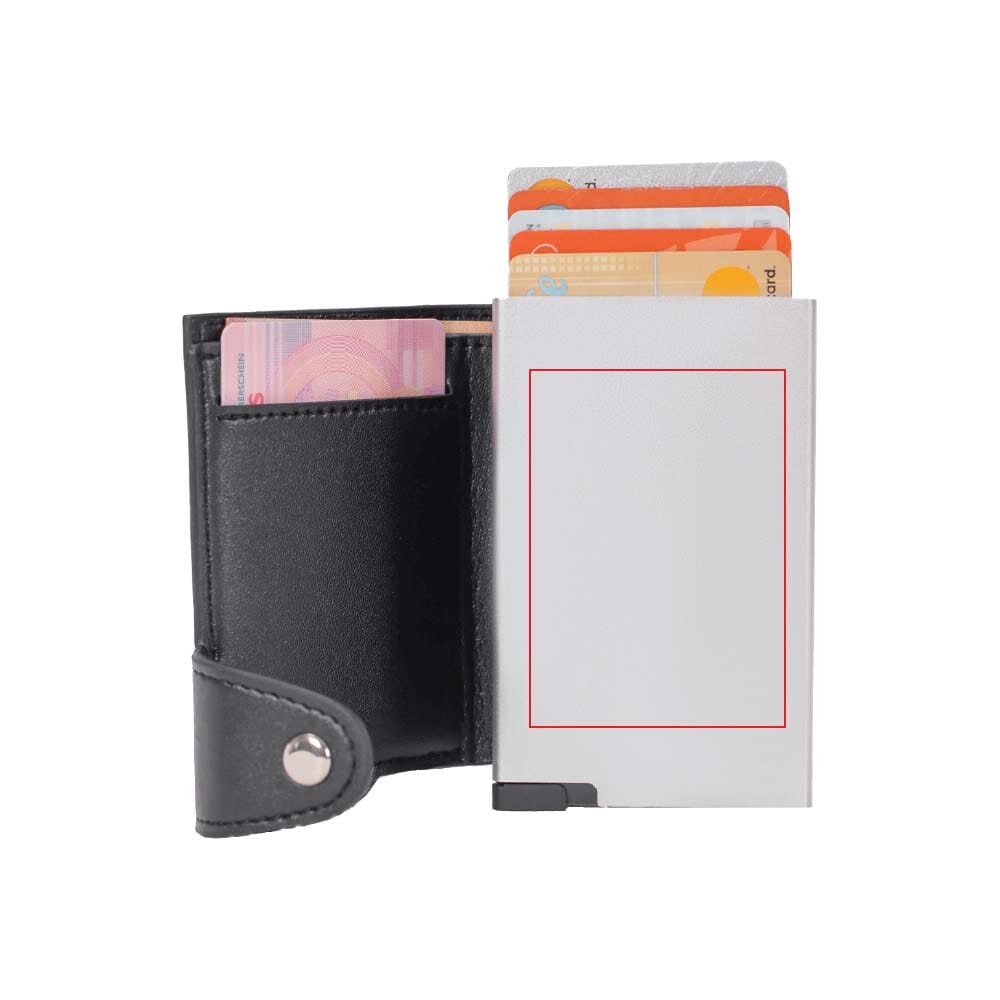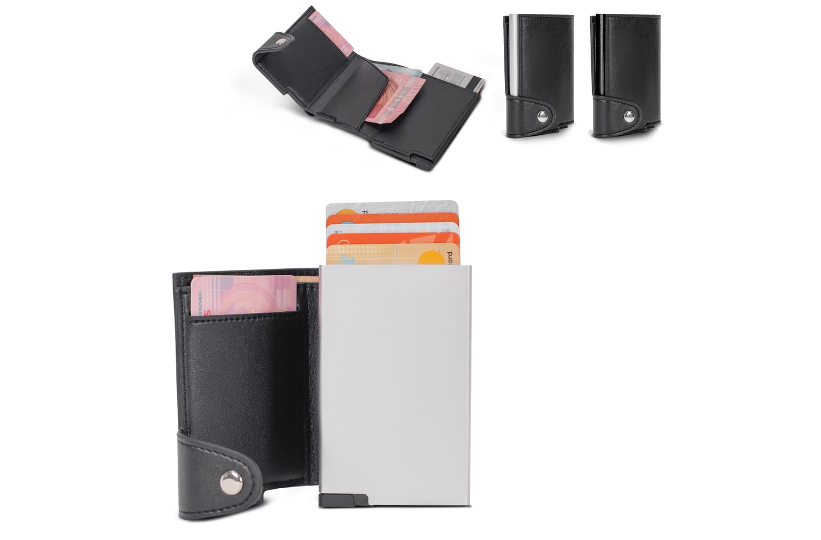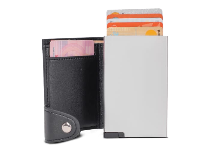 Uniek design aluminium kaarthouder met leerlook hoesje. De kaarthouder beschermt (bank)passen tegen RFID skimming. Druk op de knop en zes kaarten (vier met verdikte letters) komen getrapt uit de houder. Het hoesje biedt plaats aan een extra (bank)pas en bankbiljetten