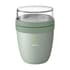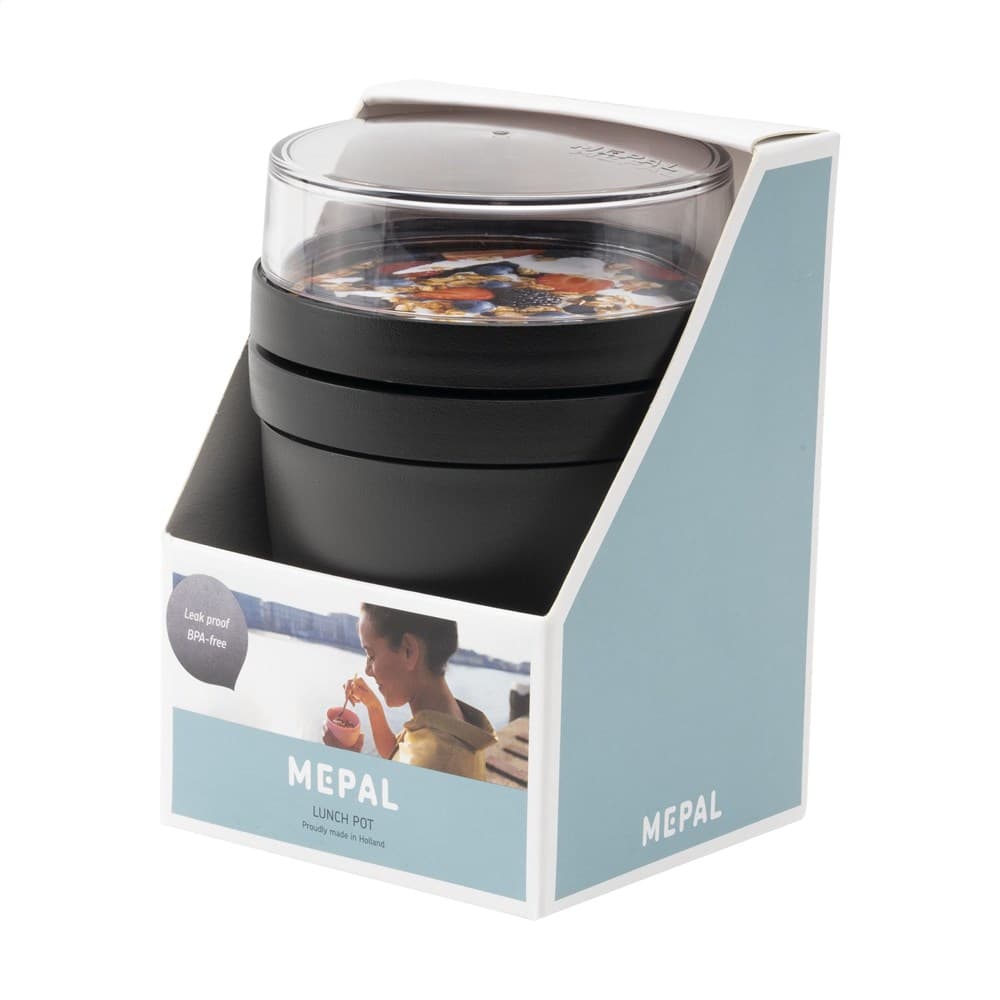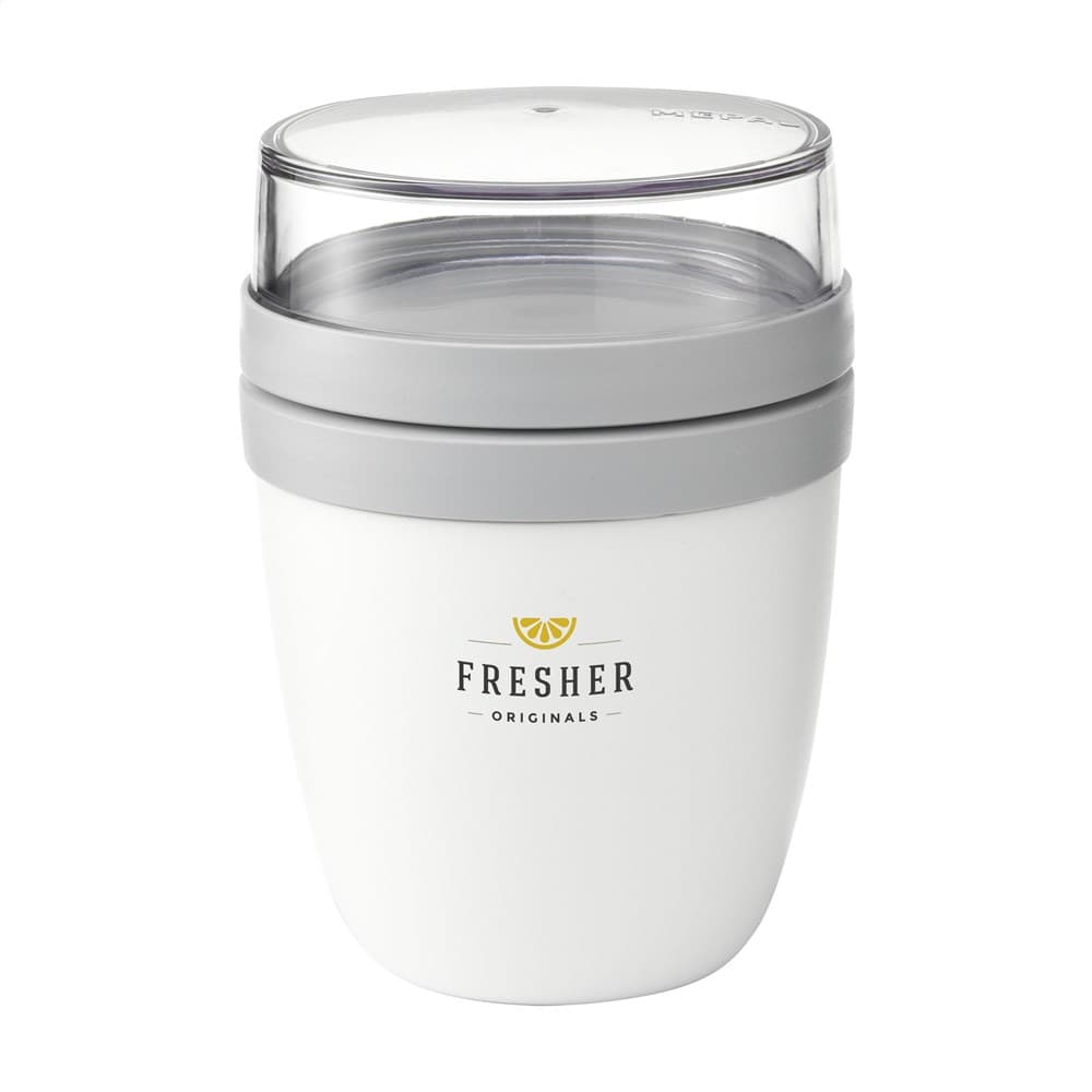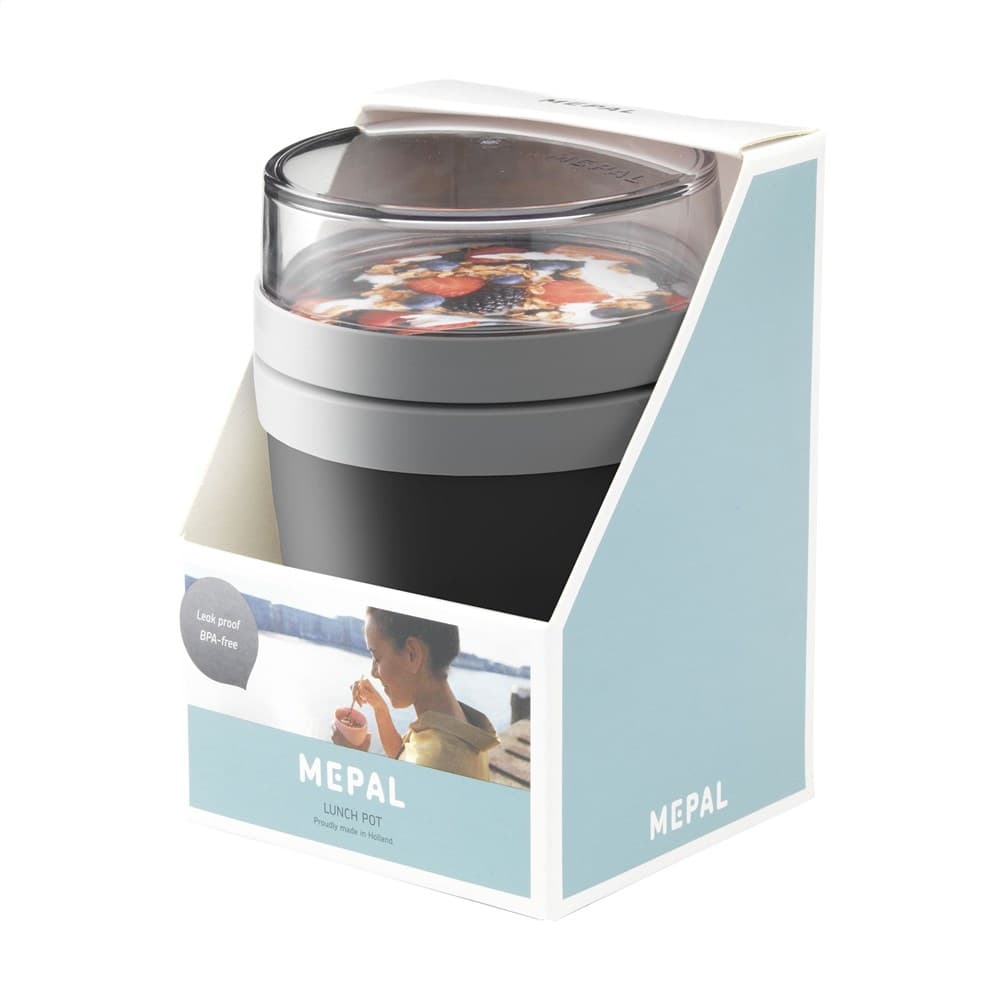 Deze duurzame, kunststof foodjar van het merk Mepal is een handig product om je lunch of tussendoortje mee te nemen. De foodjar heeft twee compartimenten. Door middel van een draaibeweging scheid je de twee compartimenten van elkaar. Beide delen hebben een aparte deksel. Dé oplossing om geknoei tijdens het mengen te voorkomen. De inhoud van het bovenste transparante compartiment is 200 ml, dit betekent dat er ongeveer 75 gram muesli of fruit in past. De inhoud van het onderste compartiment is 500 ml, genoeg voor een royale portie soep, noedels of yoghurt. Een hoogwaardig kwaliteitsproduct. BPA-vrij, Food Approved en lekvrij. Geschikt voor magnetron (deksel uitgezonderd) en vriezer. Met 2 jaar Mepal fabrieksgarantie. Made in Holland. VOORRAAD INFORMATIE: Tot 1.000 stuks beschikbaar binnen 10 werkdagen. Uitzonderingen voorbehouden.