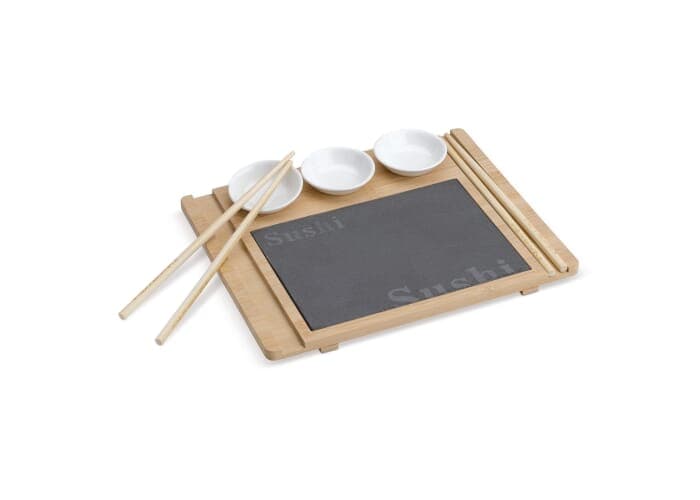 Tweepersoons sushi bestaande uit een houten serveerplateau met daarin een leistenen sushi plaat en wordg geleverd inclusief twee setjes eetstokjes en drie keramische kommetjes.