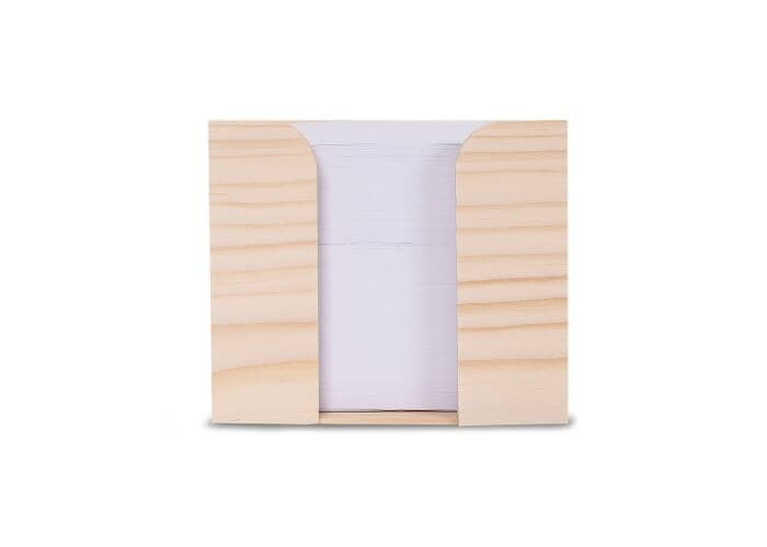 Tijdloze houten kubushouder gevuld met circa 650 vellen van 100% gerecycled papier van 90g/m².