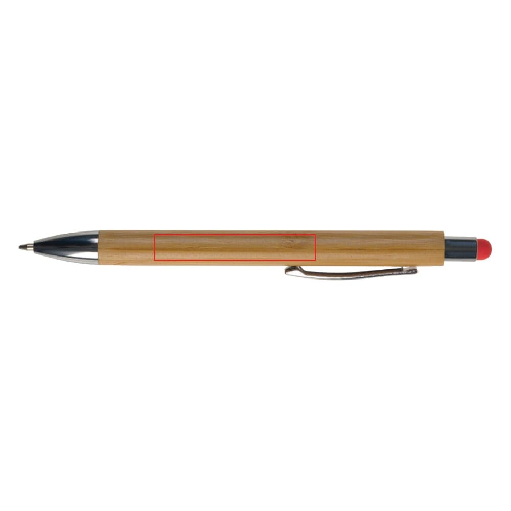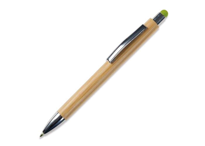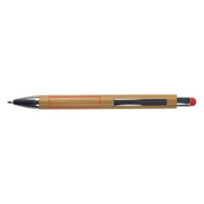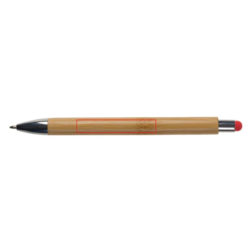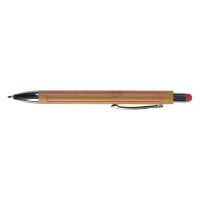 Balpen van bamboe materiaal met gemetalliseerde drukker en punt en metalen clip. De pen bevat een gekleurde stylus om een touchscreen te bedienen. Bevat een blauwschrijvende Jumbo vulling.