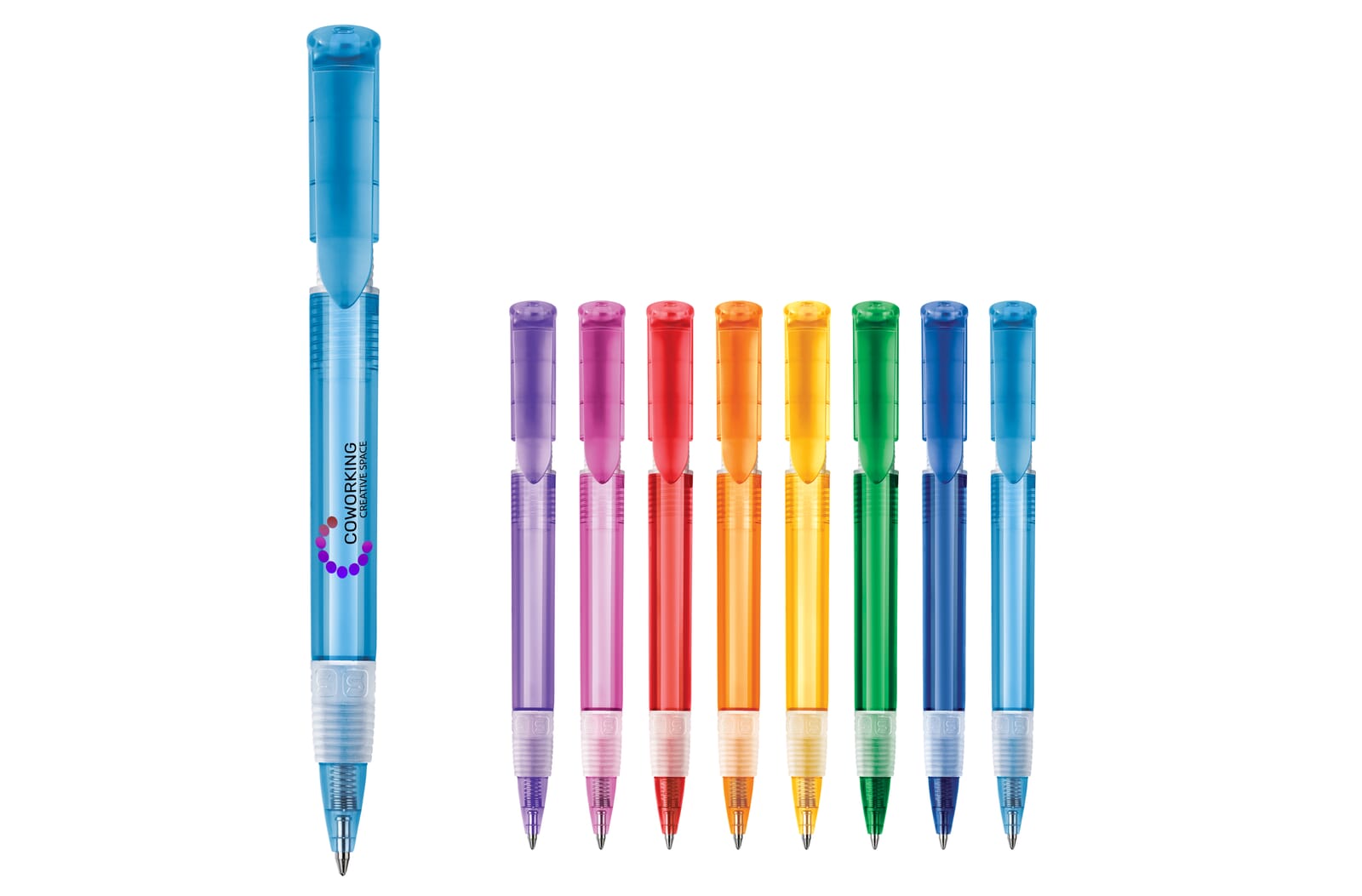 De S40 Grip Clear balpen is een populaire pen door de transparante kleuren en bedrukbare clip welke karakter en stijl geeft aan de pen en de grip op de pen welke dezelfde kleur als de clip heeft. De barrel kan eenvoudig voorzien worden van een bedrukking. Het bevat een drukmechaniek en een Toppoint jumbo vulling met blauw schrijvende inkt. De hardcolour pen is gemaakt van ABS, geproduceerd in Europa. Kleur combinaties voor deze pen zijn mogelijk vanaf 5.000 stuks.