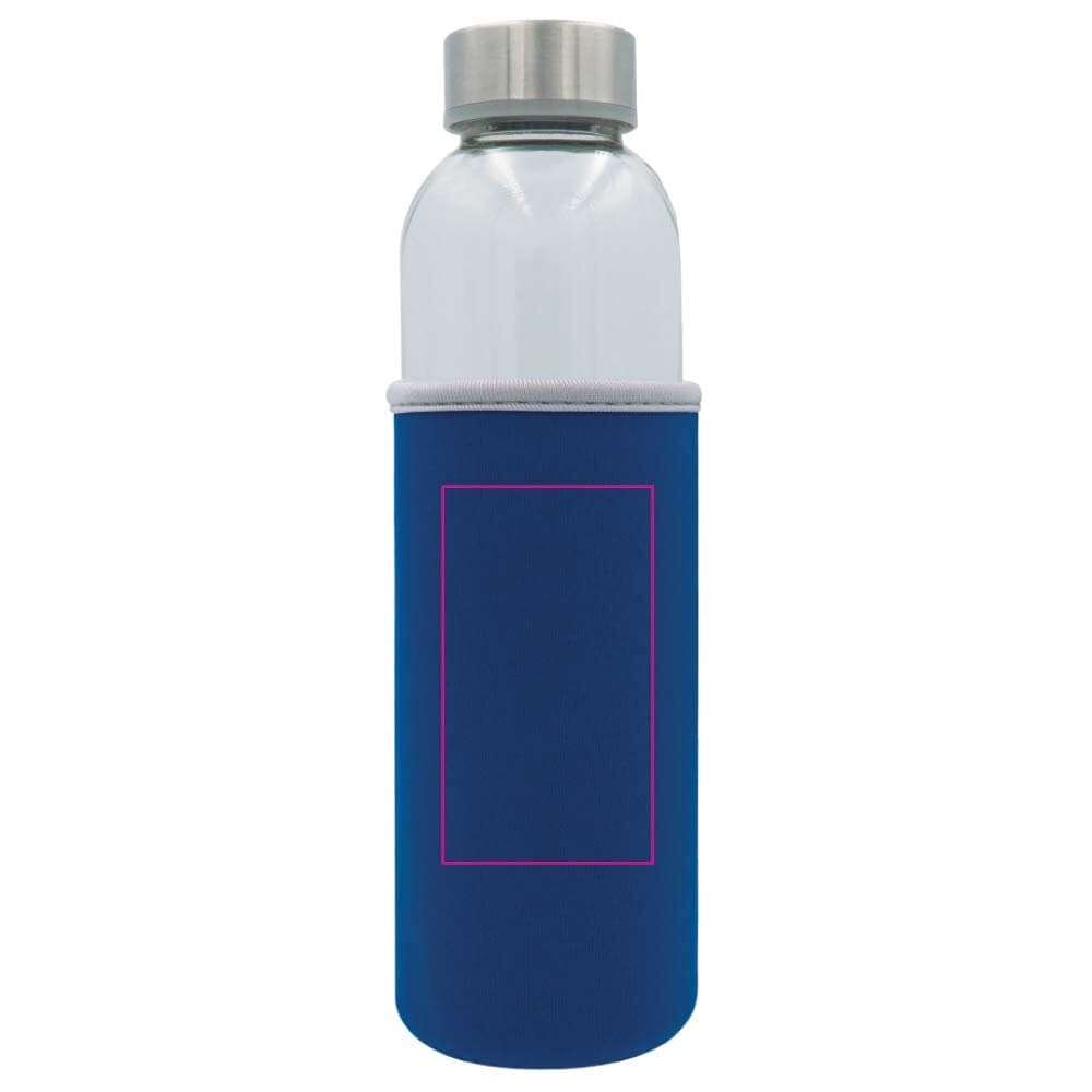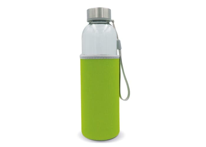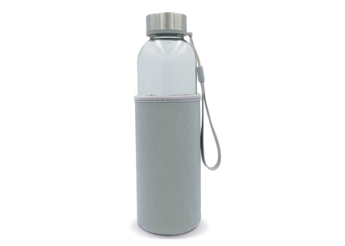 Glazen waterfles met sleeve. De fles zorgt er voor dat dranken langer koel blijven door middel van de sleeve er om heen. Inclusief een bandje aan de dop voor het eenvoudig vasthouden van de fles. Geschikt voor koude, koolzuurhoudende en niet-koolzuurhoudende dranken. Wordt verpakt in geschenkverpakking.