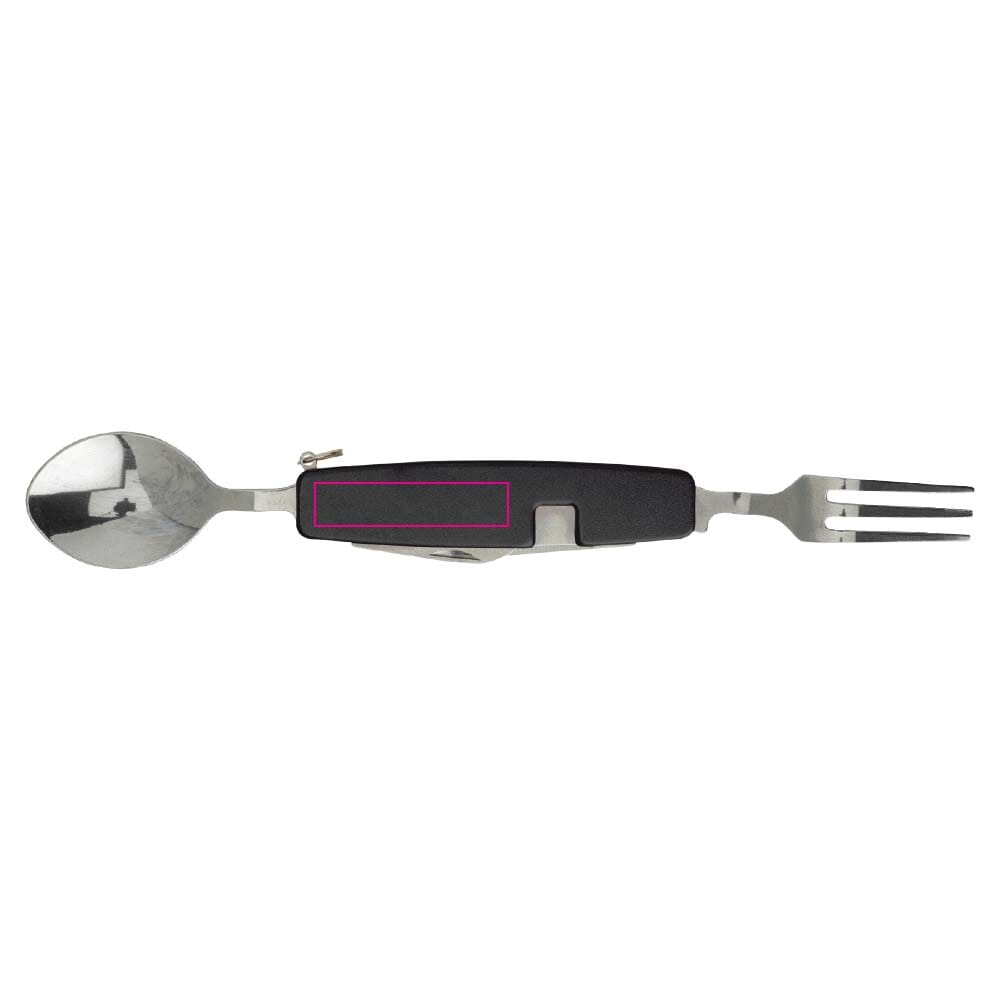 Deze outdoor bestekset is als multi-tool compact, handzaam en eenvoudig. Deze tool bevat een mes, vork, leper en flesopener.