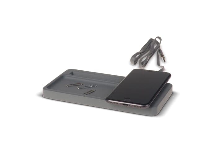 Deze bureau organizer van leisteen cement heeft een ingebouwde draadloze oplader van 5 Watt. Zo kan er ten alle tijden, mobiele apparaten opgeladen worden die over een draadloos laden functie beschikken. Inclusief telefoonstandaard en een bakje waar kleine bureauartikelen in opgeborgen worden.