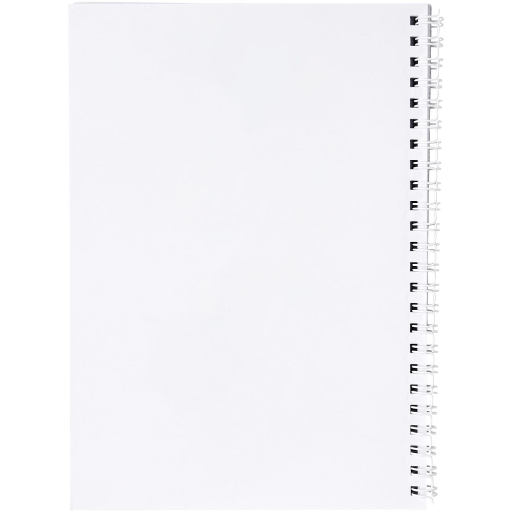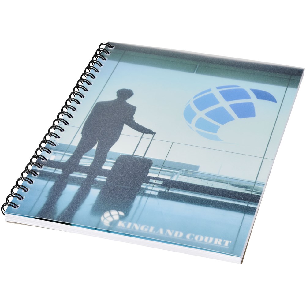 Desk-Mate® spiraal A5 notitieboek. Standaardmodel bevat 50 blanco vellen van 80 g/m2 papier, een glanzende kartonnen voorkant (250 g/m2) en een transparante polypropyleen omslag van 450 micron. Zwarte of witte draad. Ook verkrijgbaar met 100 vellen. Je kunt de pagina's van dit veelzijdige notitieboek aanpassen met elk gewenst ontwerp - dus of je nu gelinieerd papier, vierkanten of stippen wilt - alles is mogelijk!