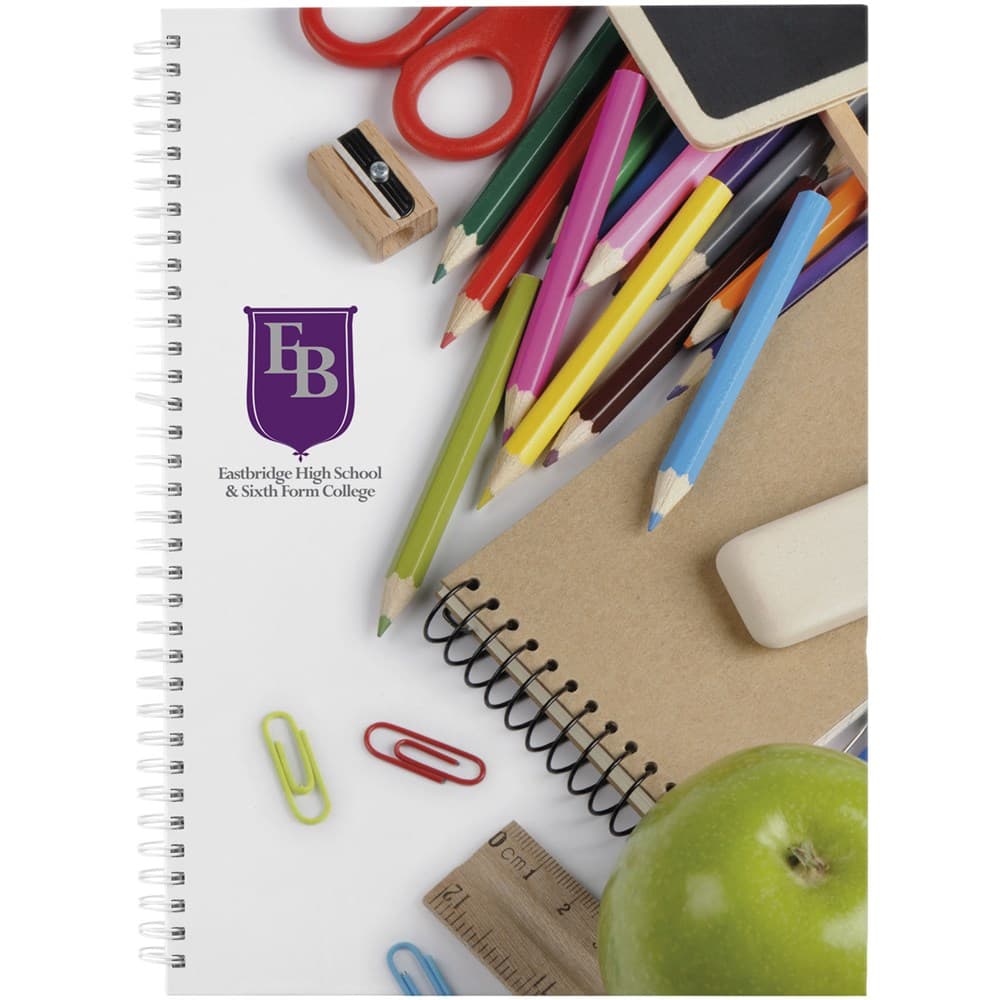 Bevat 80 vellen (80 g/m2) blanco papier en heeft een zwarte of witte spiraal. Verkrijgbaar in 3 formaten: A4, A5 en A6. Decoratie in kleur mogelijk op de omslag, op elk blad, en de voor- en achterkant. Ideaal voor het bedrukken van notitieblokken.
