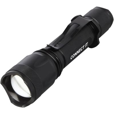 Kom nooit zonder batterij te zitten met deze oplaadbare, krachtige tactische aluminium zaklamp. De stevige zwarte behuizing van aluminiumlegering biedt een tactische uitstraling, met een schokbestendigheid van 1 meter. De zaklamp heeft een riemclip om gemakkelijk mee te nemen en is spatwaterdicht met een IPX4-classificatie. De 5 W led genereert 300 lumen voor maximaal 3 uur en heeft een straalafstand van 200 meter met 5 verschillende lichtstanden: hoog, medium, laag, stroboscoop en SOS. Het hoge vermogen komt van een ingebouwde lithiumbatterij met een capaciteit van 2000 mAh. De zaklamp heeft een afmeting van 14,5 x 3,4 cm en weegt slechts 170 gram. Wordt geleverd met een gebruiksaanwijzing en is verpakt in een geschenkverpakking van gerecycled karton met een afmeting van 17,5 x 6 x 4 cm. Lasergravure op de aluminium behuizing wordt aanbevolen.