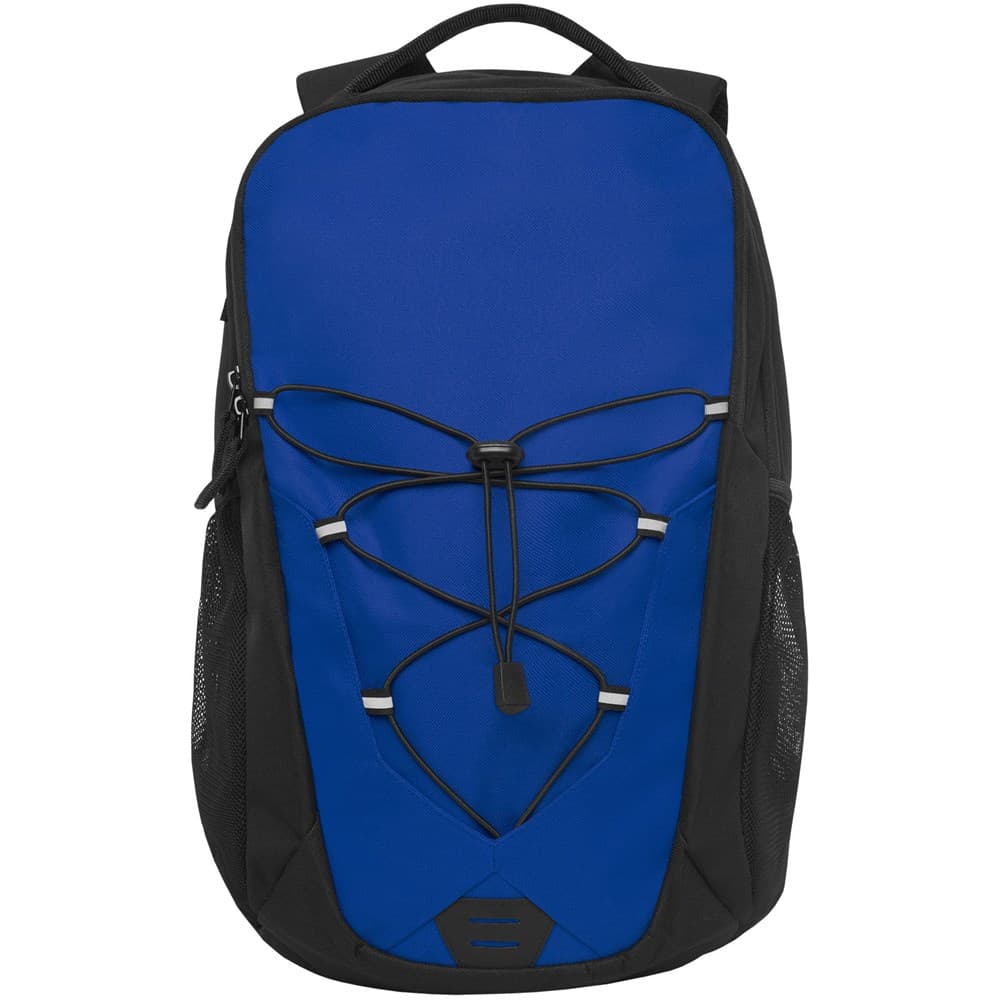 Een mix van een outdoor- en dagelijkse rugzak met gekleurde stof en elastisch koord met reflecterende accenten op het voorpaneel. Voorzien van twee externe meshed waterflesvakken, voorvak met verschillende kleinere vakjes, een haak voor eenvoudige opslag, en een 12" tablethoes. De rugzak heeft een gewatteerd versterkt hengsel en een comfortabele gewatteerde achterkant. Ruimte voor een 15,6" laptop in een gewatteerde hoes in het hoofdvak.