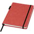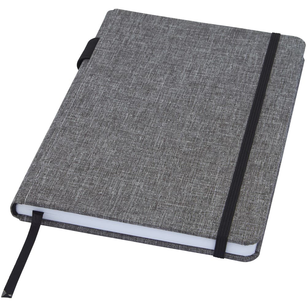 Notitieboek in A5 formaat met cover gemaakt van RPET-stof. Bevat 96 vellen 70 g/m² gerecycled papier met gelijnde lay-out, een penlus en lint. Verpakt in een kartonnen hoes.
