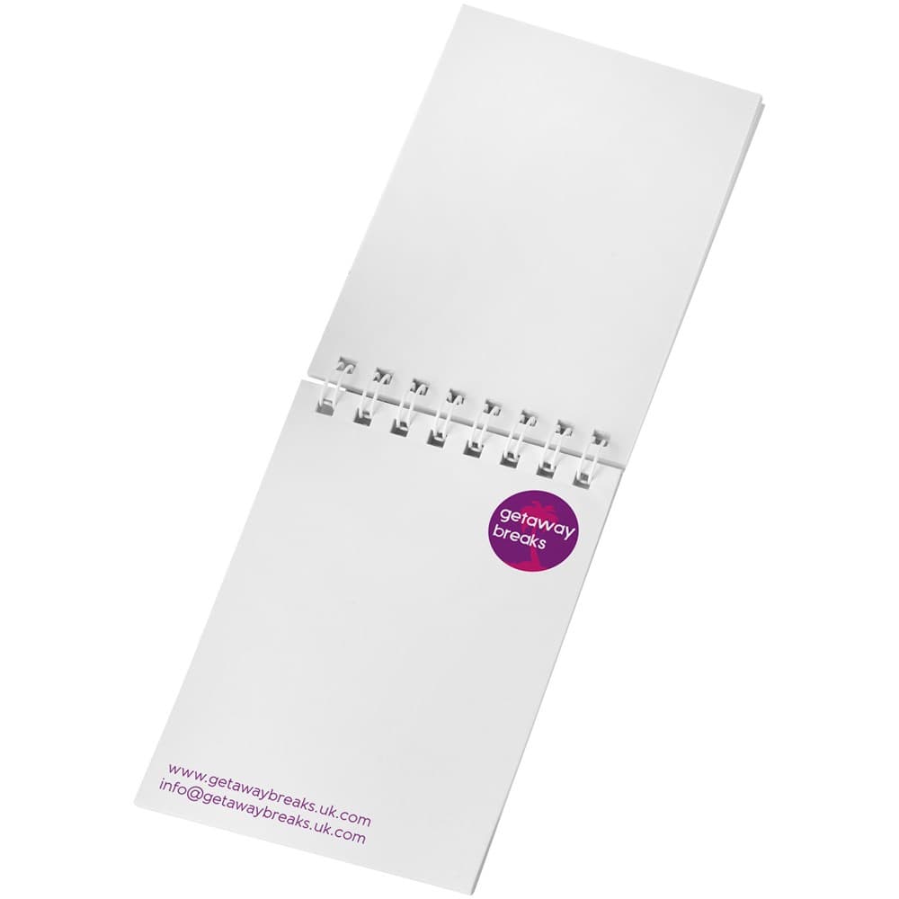 Desk-Mate® spiraal A7 notitieboek. Dit notitieboek heeft een witte of zwarte spiraal, een omslag van glanskarton (250 g/m2) en 50 vellen (80 g/m2) blanco papier. Je kunt de pagina's van dit veelzijdige notitieboek aanpassen met elk gewenst ontwerp - dus of je nu gelinieerd papier, vierkanten of stippen wilt - alles is mogelijk!