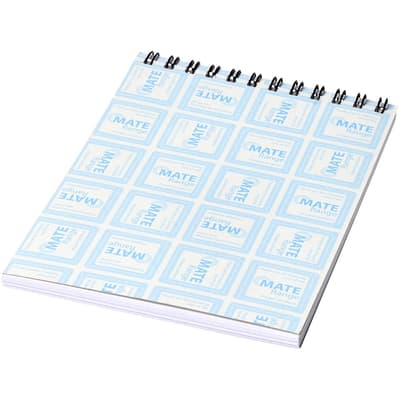 Desk-Mate® spiraal A6 notitieboek. Dit notitieboek bevat een witte of zwarte draad, een glanzende kartonnen voorkant (250g/m2) en (80g/m2) blanco papier. Standaard geleverd met 50 vel, ook leverbaar met 80 vel. Je kunt de pagina's van dit veelzijdige notitieboek aanpassen met elk gewenst ontwerp - dus of je nu gelinieerd papier, vierkanten of stippen wilt - alles is mogelijk!