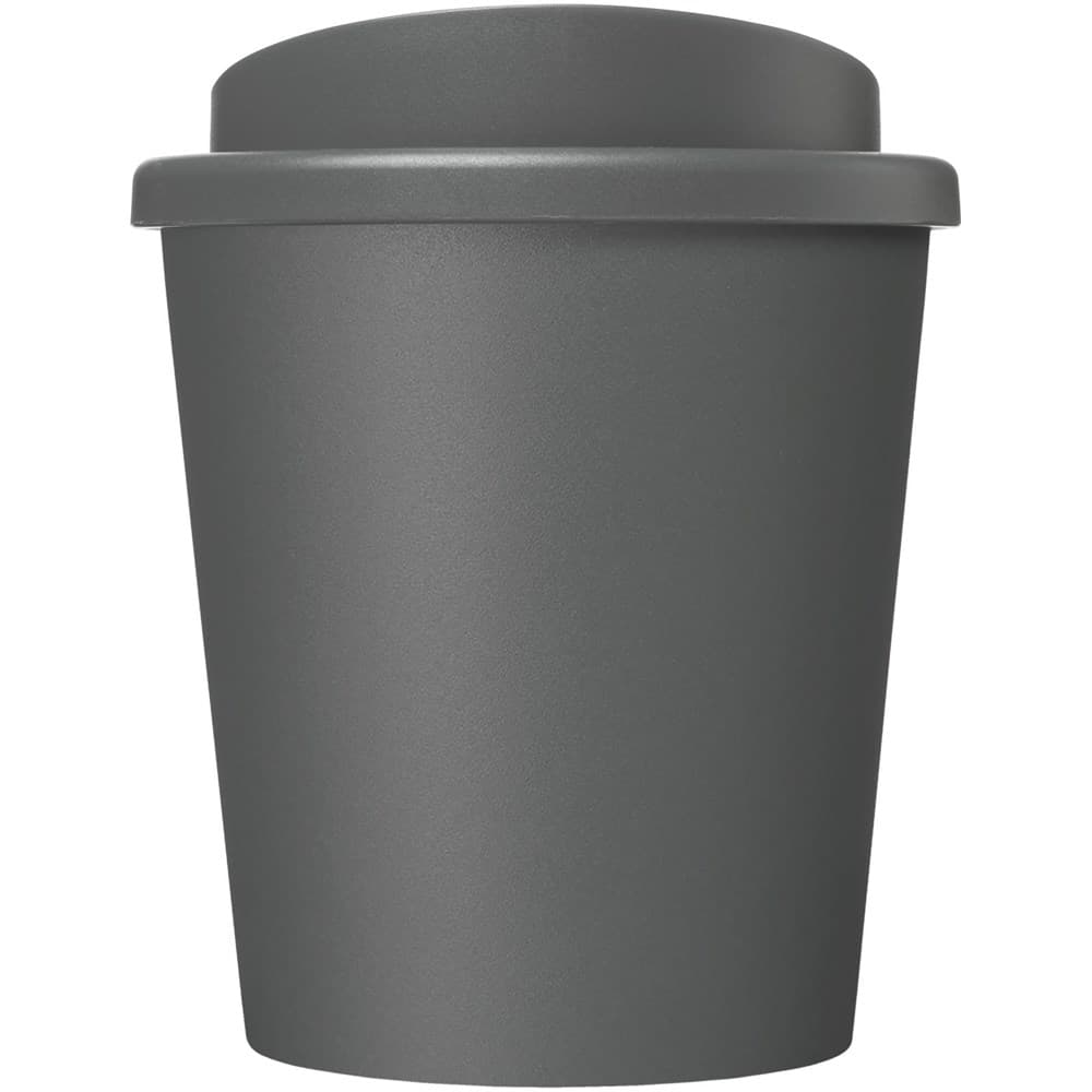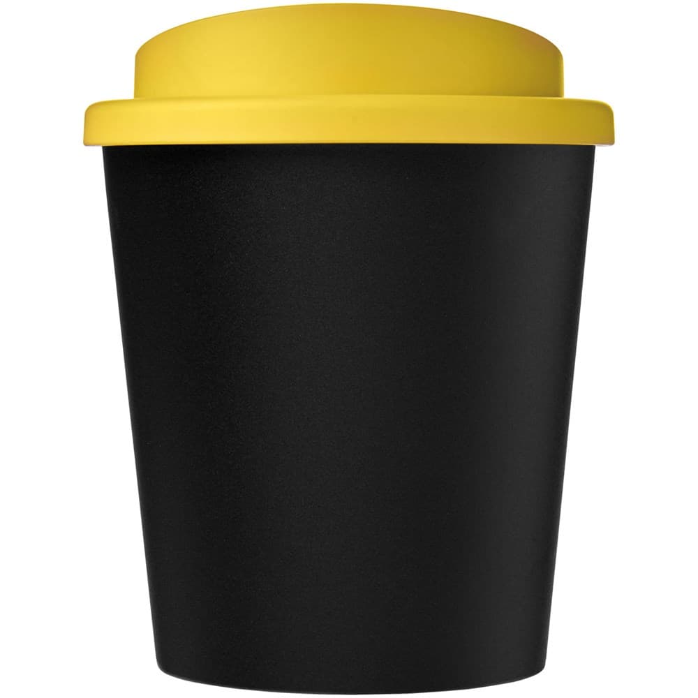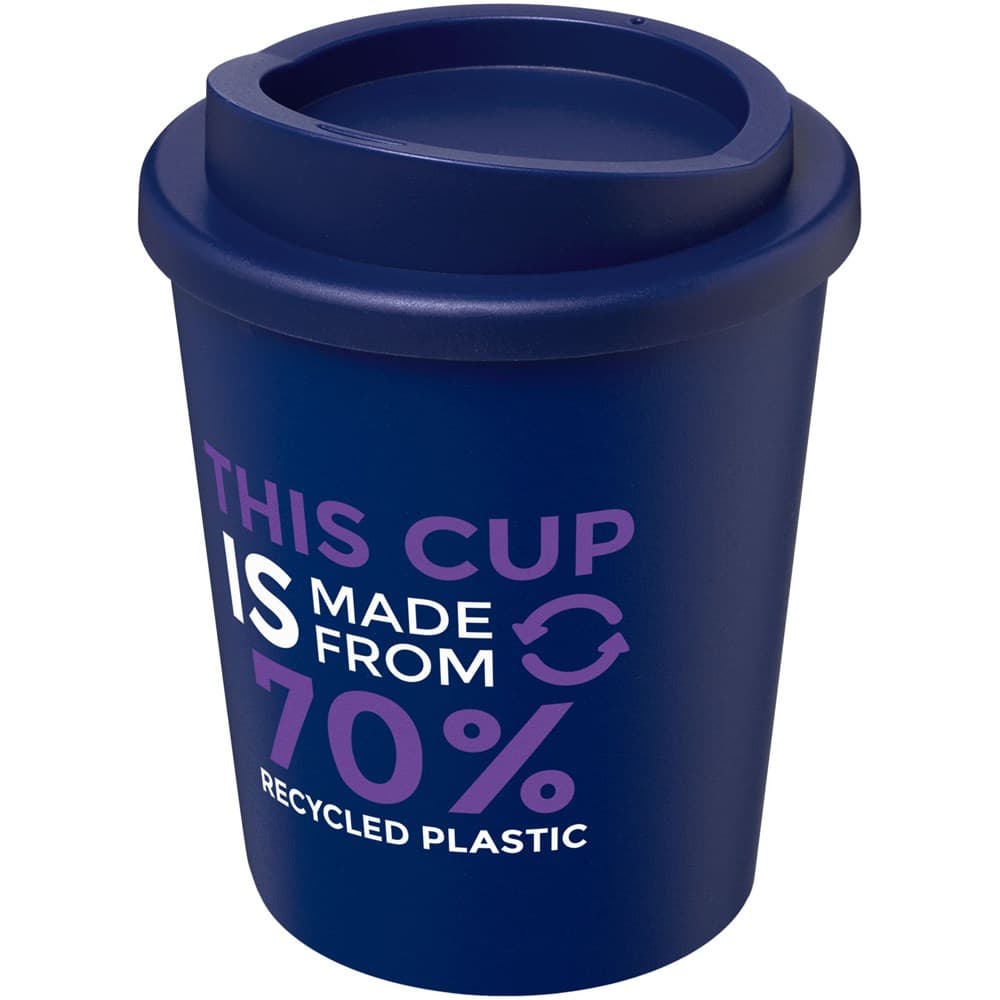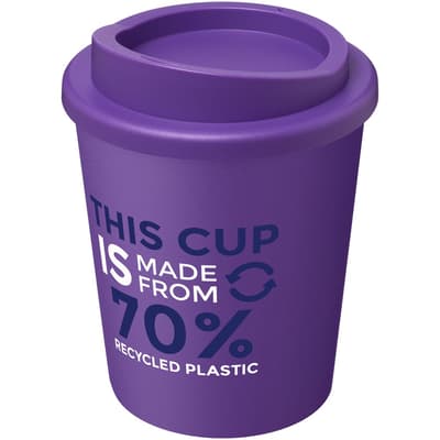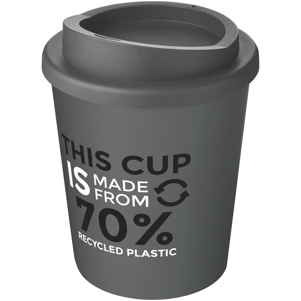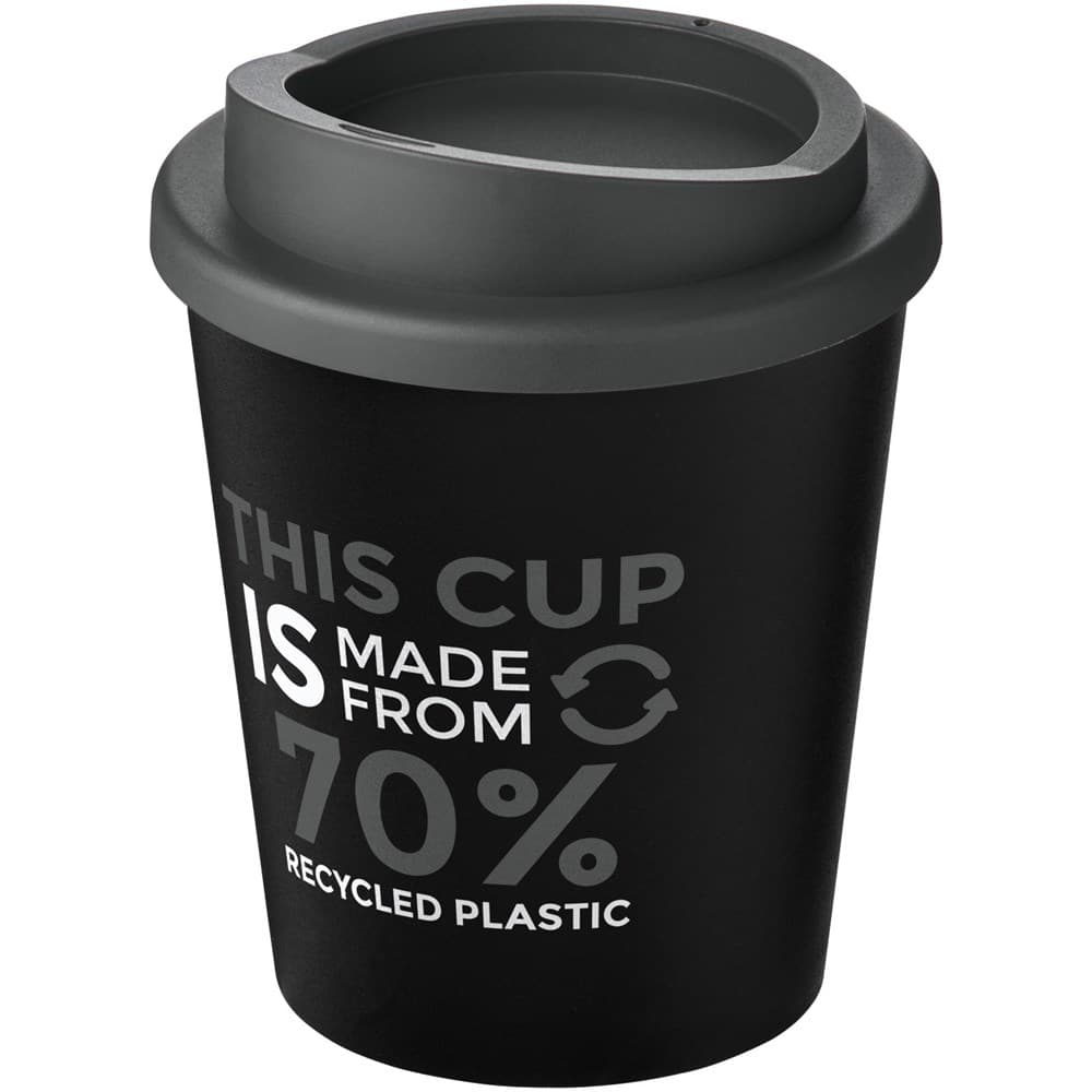 Compacte, dubbelwandige geïsoleerde beker met draaideksel. Past onder de meeste koffiezetapparaten. De beker is in totaal 75% gerecycled, met een gerecyclede beker met zwarte binnenlaag, en een standaard deksel. Omdat de deksel niet is gemaakt van gerecycled materiaal kan het worden besteld in een brede variatie aan kleuren. De mok is volledig recyclebaar. De kleur van het zwart kan variëren door de aard van het gerecycleerde materiaal. Inhoud 250 ml Gemaakt in het Verenigd Koninkrijk. Verpakt in een thuis composteerbare polybag.